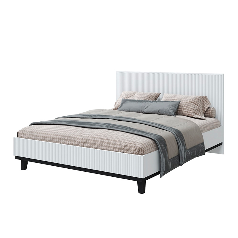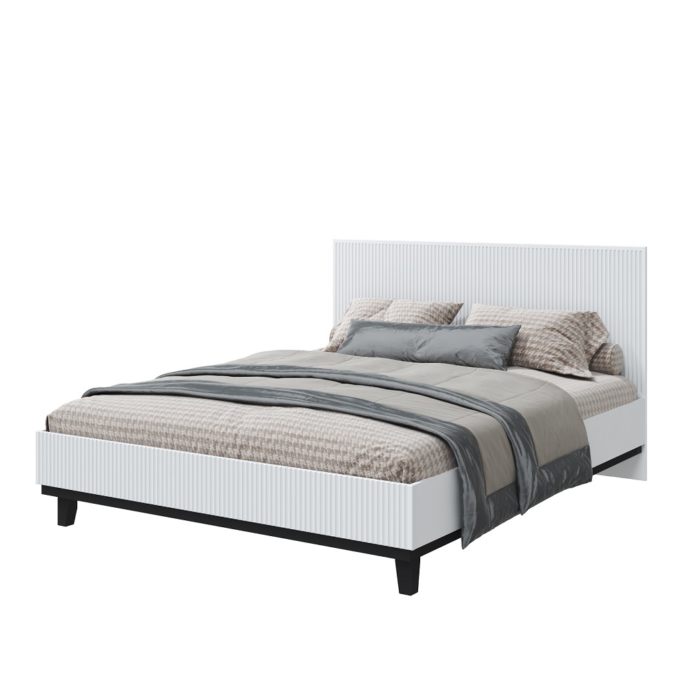 Запросить индивидуальное предложениеСтильная двуспальная кровать. Каркас изготовлен из ЛДСП 16 мм в декоре белое сияние, опоры из массива березы покрыты черным лаком. Текстурное изголовье кровати выполнено из МДФ 16 мм в декоре белый снег софт.