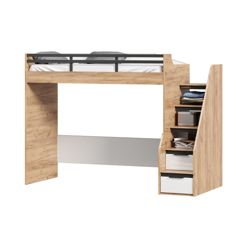 • Слева у кровати-чердака правой и справа у кровати-чердака левой, расположена интегрированная лестница шириной 444 мм. 5 ступеней из ЛДСП 16 мм с планками под каждой. Планка из ЛДСП 16 мм чёрного цвета, характерный декоративный элемент коллекции Урбан, служит для усиления ступеней.