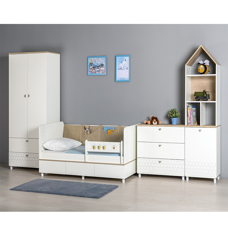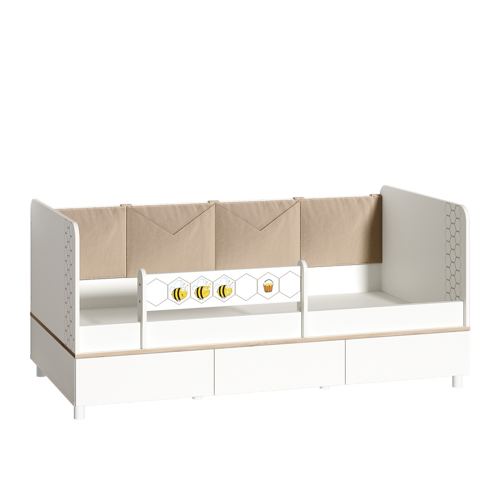 Кровать оснащена съёмным мягким элементом с карманами, передвижным бортиком и декорирована оригинальным рисунком - мультяшными пчёлками, которые никого не оставят равнодушным.