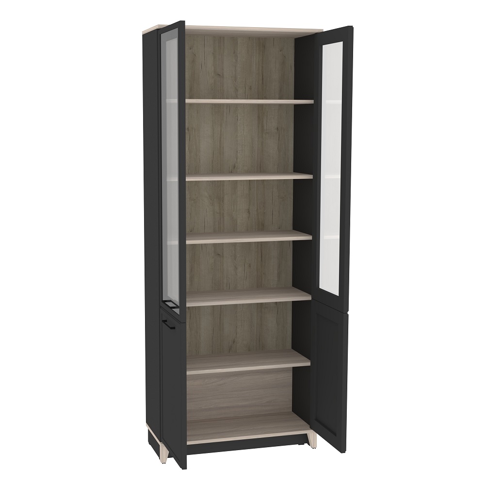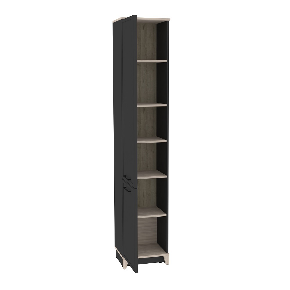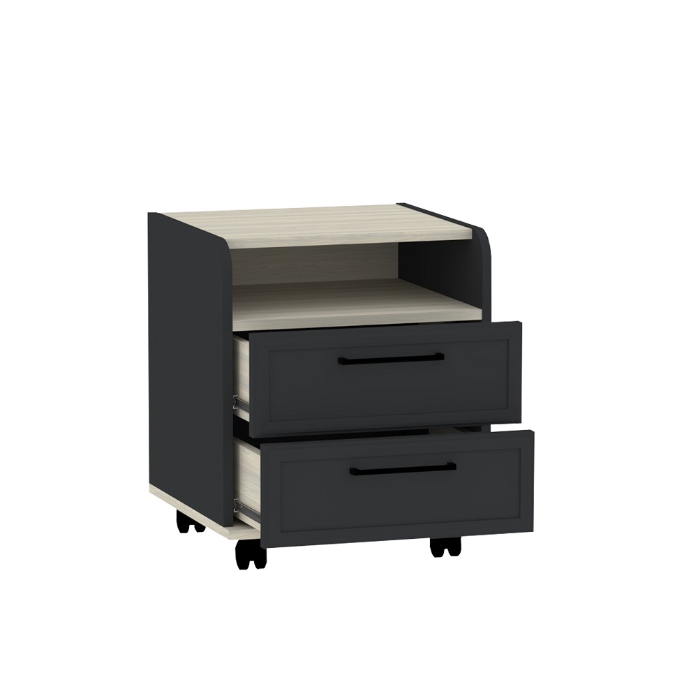 коробу для хранения. Шариковые направляющие обеспечивают выдвижным ящикам лёгкое бесшумное открывание. Чёрные ручки из литого металла подчеркивают эстетику коллекции. Кромка ПВХ толщиной 2 мм.