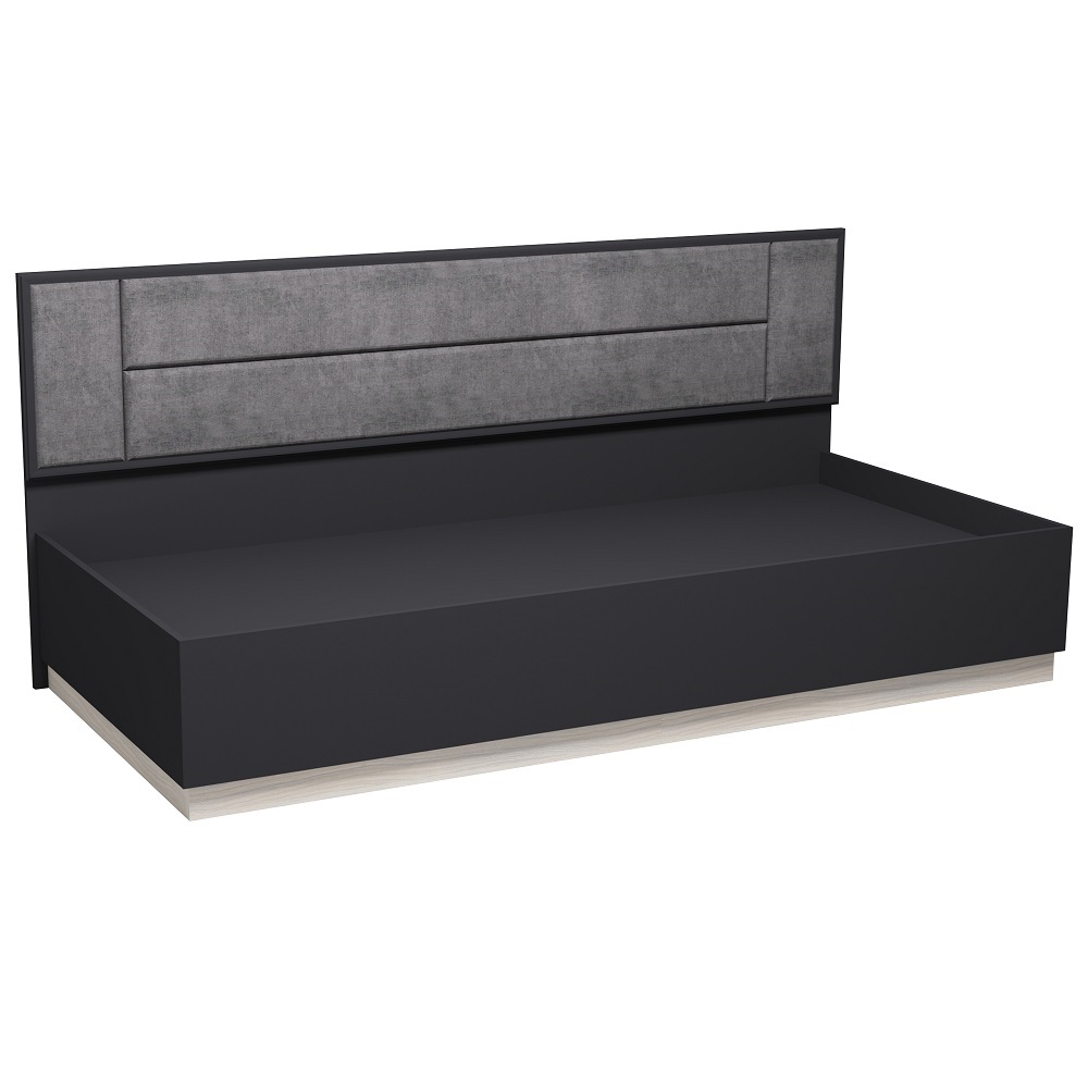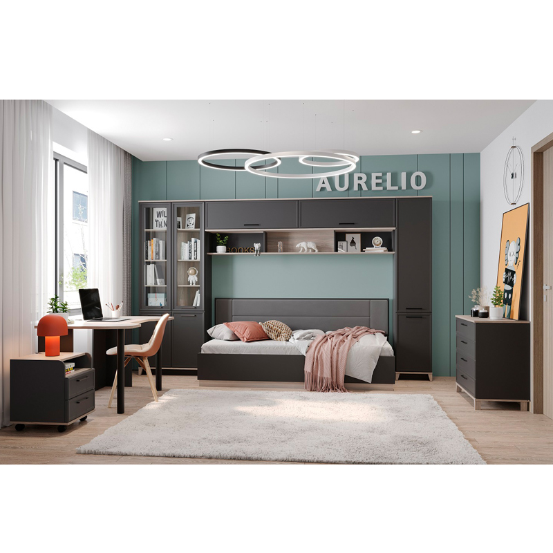 Молодёжная выполнена в одном стиле со всей коллекцией AURELIO. Фасады толщиной 10 мм из ЛДСП класса эмиссии Е1 обрамлены тонким фигурным профилем МДФ. Корпус выполнен из ЛДСП 16 мм. Задняя стенка шкафов в древесном декоре станавливается в паз и обеспечивает дополнительную устойчивость и аккуратный вид мебели. Мягкие подушечки кроватного изголовья укутаны в шелковистый на ощупь велюр благородного серого оттенка. Дополняет изголовье элегантный профиль. Подъемный механизм кровати открывает доступ к вместительному