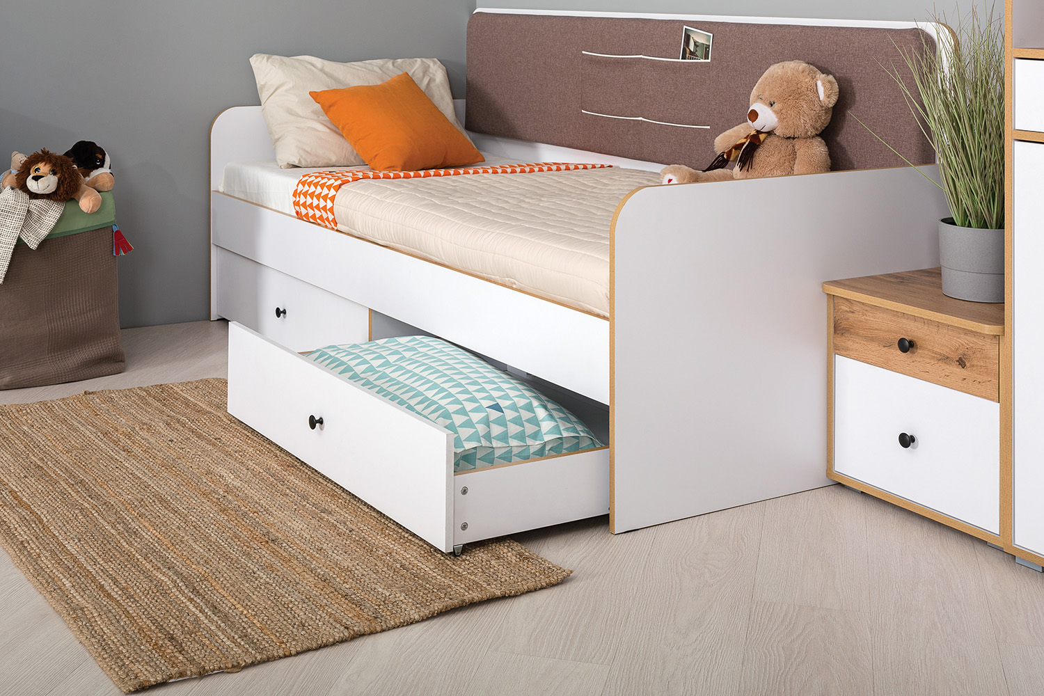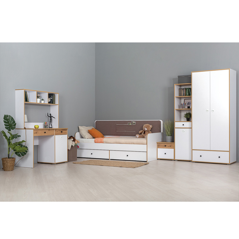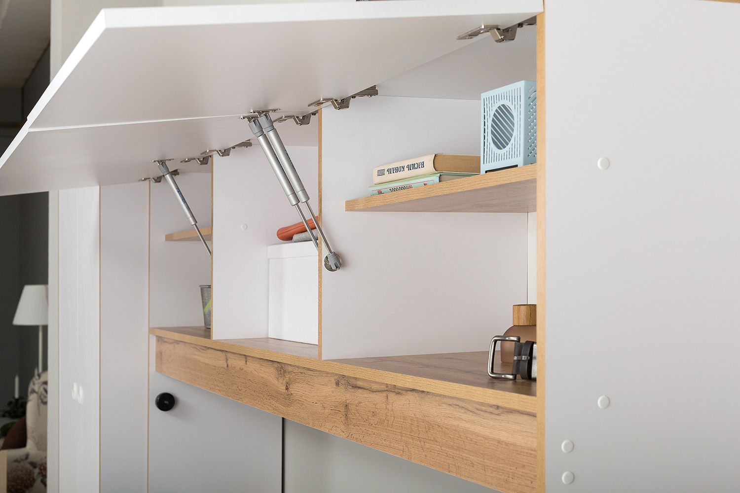 Корпус и фасады шкафа изготовлены из экологически чистой ламинированной ДСП толщиной 16 мм, а торцы окромлены ПВХ-плёнкой толщиной 0,4 мм. Лицевая фурнитура выполнена из чёрного пластика, а при отсутствии лицевой фурнитуры фасады открываются за вырез по центру. Распашные двери модулей молодёжной Вуди установлены на четырёхшарнирных петлях без доводчиков. Выдвижной ящик на шариковых направляющих обеспечивает тихую и долговечную работу.