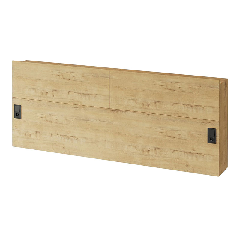 Кроватный блок предназначен для использования совместно с кроватью или диваном. Блок имеет два отделения за откидными дверьми и открытую полку над ними. Двери открываются за кромку, с помощью газовых кронштейнов. Кроватный блок оснащен светодиодным светильником, расположенным на открытой верхней полке. Светильник представляет собой алюминиевый профиль с матовым экраном, внутри которого установлена светодиодная лента. С левой и с правой стороны переднего щита блока установлены выключатели светильника и эл. розетки с разъемами USB А и Type C. Блок установлен на регулируемые опоры.