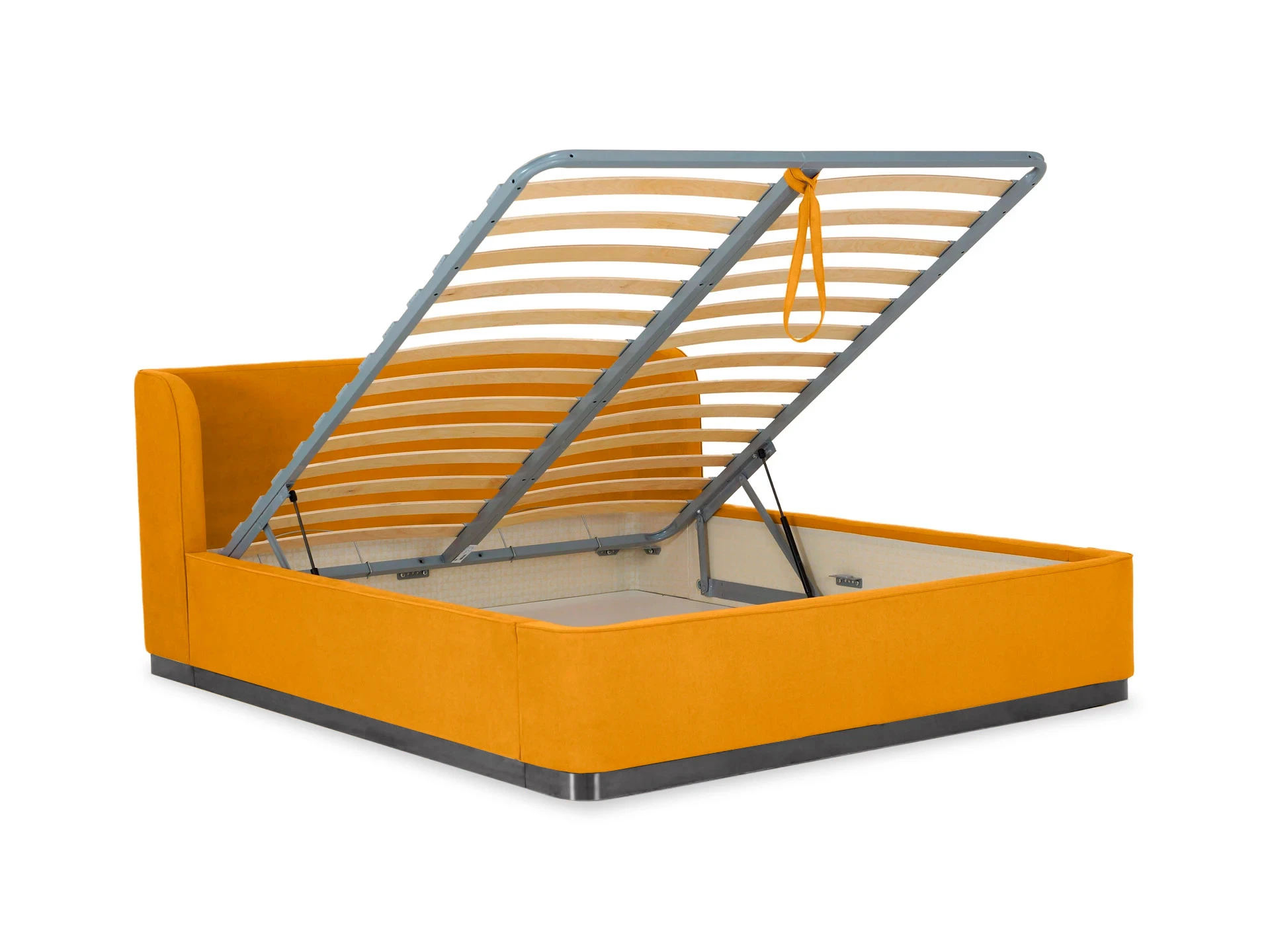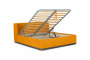 Кровать оснащена металлическим подъемным основанием с гибкими ламелями, под которым находится внутреннее отделение, предназначенное для хранения белья или других предметов. Спинка и царги кровати выполнены из плиты ЛДСтП т.22мм, брусков и березовой фанеры. Настилы из пенополиуретана и синтепона. Подиум сделан из плиты МДФ и брусков. Нижнюю часть подиума украшает металлическая лента из нержавеющей стали с покрытием «матовое золото». Дно бельевого ящика: плита ЛДСтП т.16мм «Белая Гладкая».