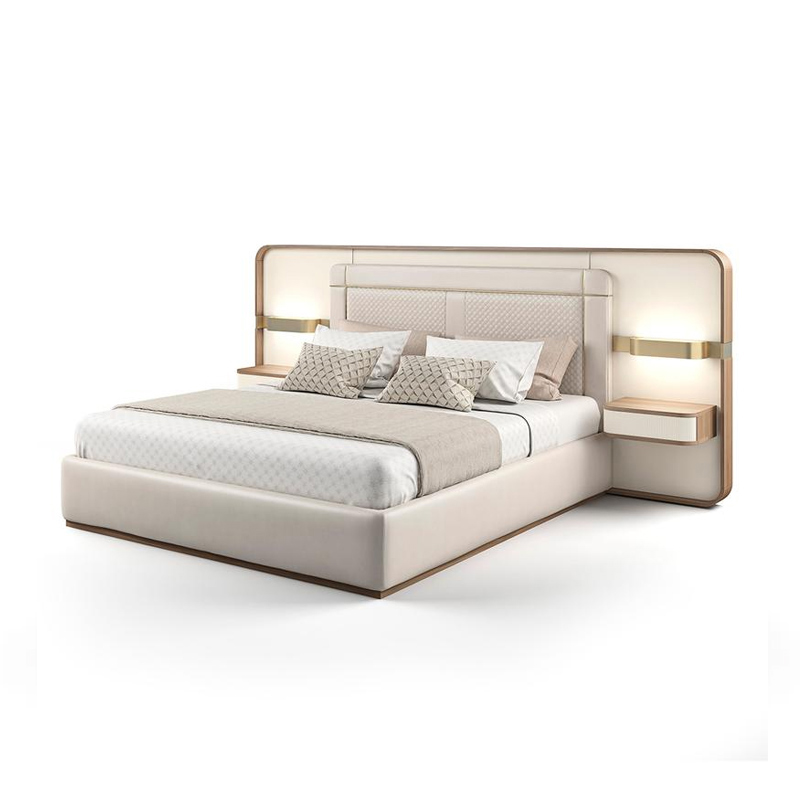 с лампами; 2 прикроватные тумбочки с 1 ящиком; лакированные деревянные планки на кожаном изголовье;
