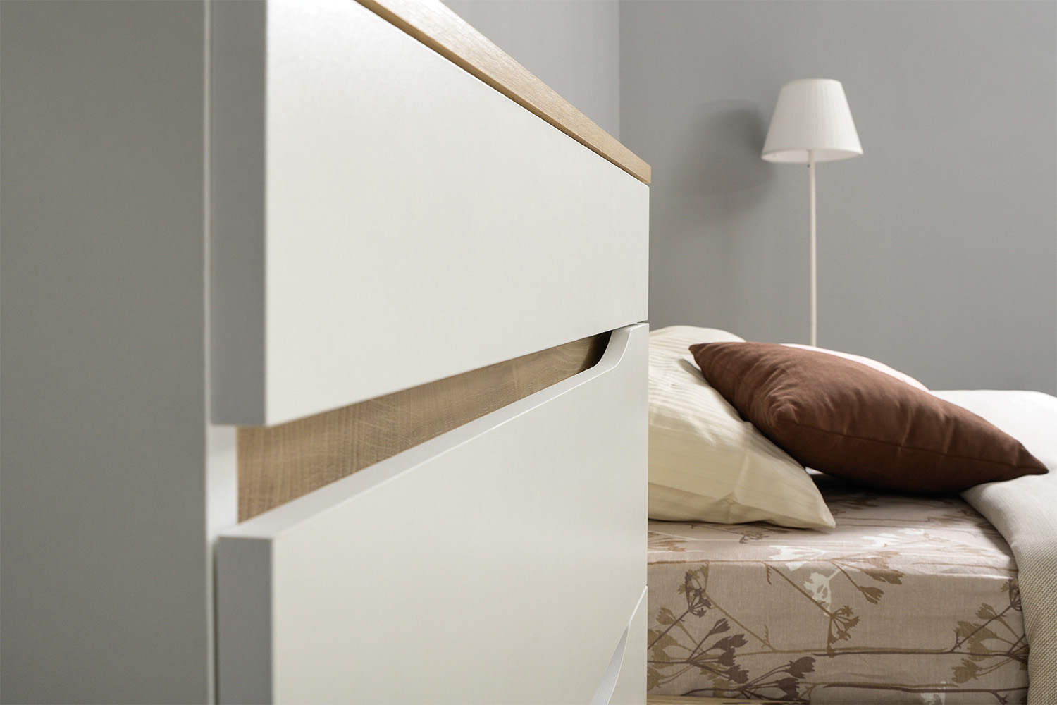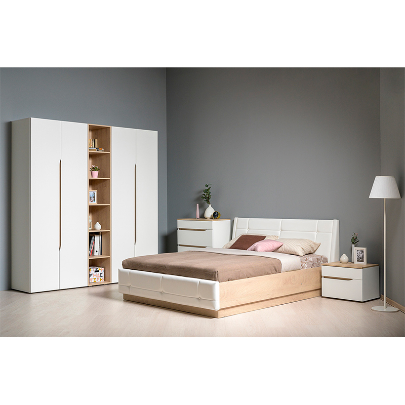Запросить индивидуальное предложениеЭто современное, практичное и уютное решение для спальни. Мягкое изголовье кровати имеет наклон, что даёт возможность не только лежать, но и комфортно сидеть, как на диване. Лицевую фурнитуру заменяет стильный вырез, открывающий древесный декор корпуса. Наполнение шкафа собирается на любую сторону, на обратной стороне распашных фасадов размещается зеркало.