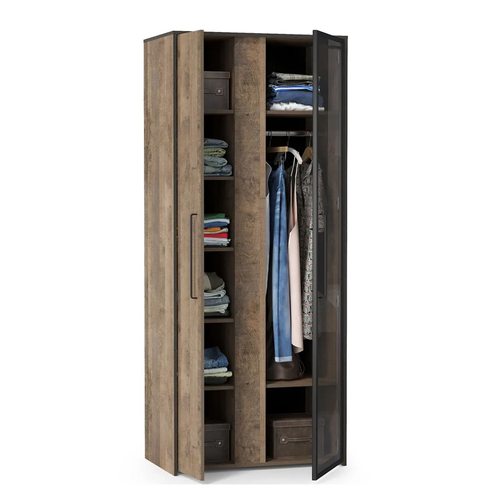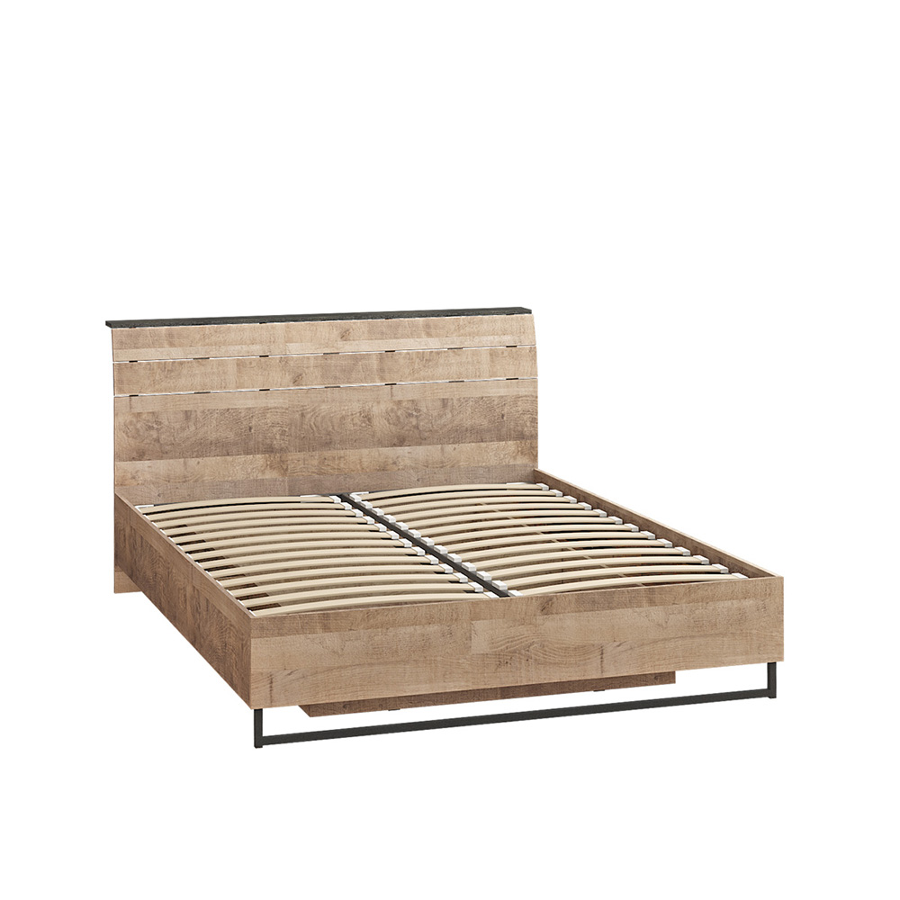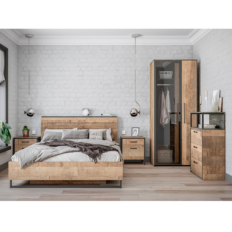 Запросить индивидуальное предложениеБрутальная спальня в стиле лофт. Планкованное изголовье с изгибом — два варианта конфигурации: с полкой и без неё. Кровать может быть оснащена ортопедическим основанием с подъёмным механизмом, который открывает доступ к вместительному коробу для хранения. Металлические опоры делают эту мебель надёжной, аутентичной и функциональной. Лицевая фурнитура с тем же покрытием придаёт мебели индустриальную эстетику. Шкаф со створкой из тонированного стекла является современным и оригинальным решением.