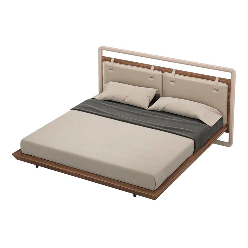 Каркас кровати выполнен из высококачественного МДФ класса Е1 в шпоне ореха и матовом лаке. Рама изголовья выполнена из массива березы и обита экокожей. Ножки металл черного цвета.