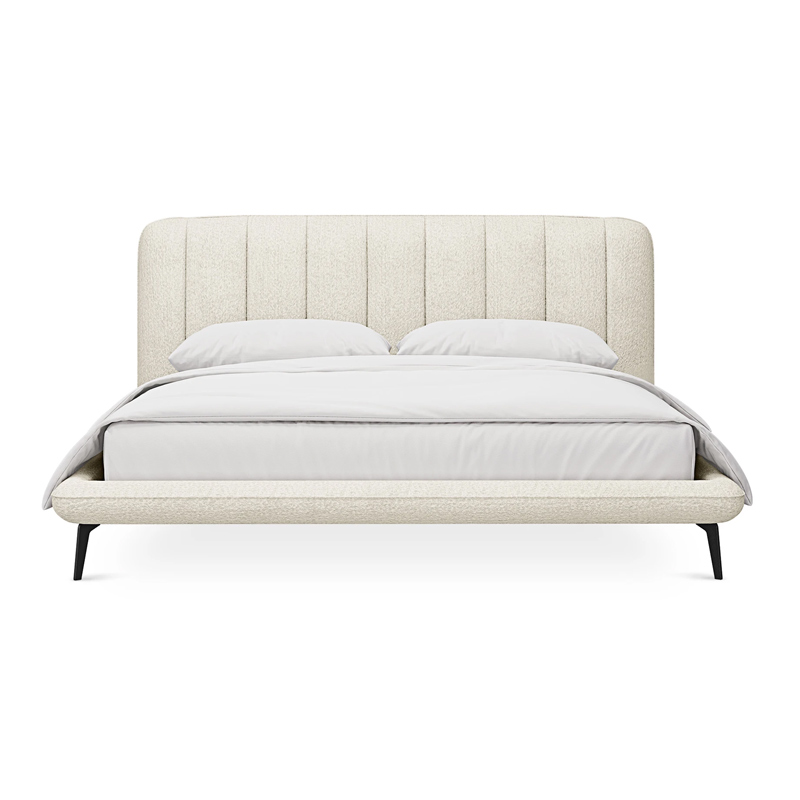 Прочные ножки из металла незаметно приподнимают корпус над полом. Поэтому кровать смотрится воздушно. Также это упрощает уборку. Мягкие изящные царги плавно перетекают в изголовье, единство с которым подчеркивается рельефным кантом.