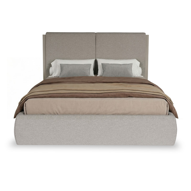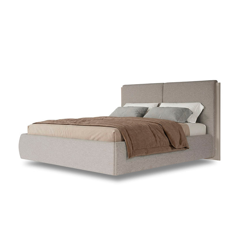 Обивка из трендовой ткани букле бежевых тонов добавляет мягкости и уютной атмосферы, а изголовье, украшенное вставками по бокам в глянцевом полиуретановом лаке светло-бежевого оттенка, придаёт изделию современный и утончённый вид.