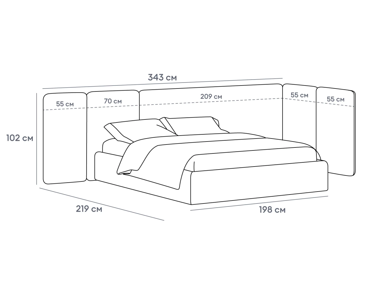 • Изголовье: Мягкие настенные панели. Внутренний каркас панелей — березовая фанера.