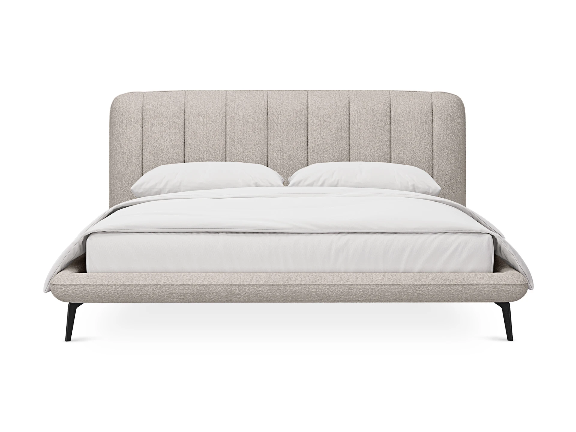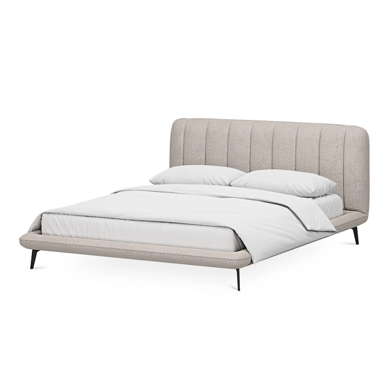 Прочные ножки из металла незаметно приподнимают корпус над полом. Поэтому кровать смотрится воздушно. Также это упрощает уборку. Мягкие изящные царги плавно перетекают в изголовье, единство с которым подчеркивается рельефным кантом.