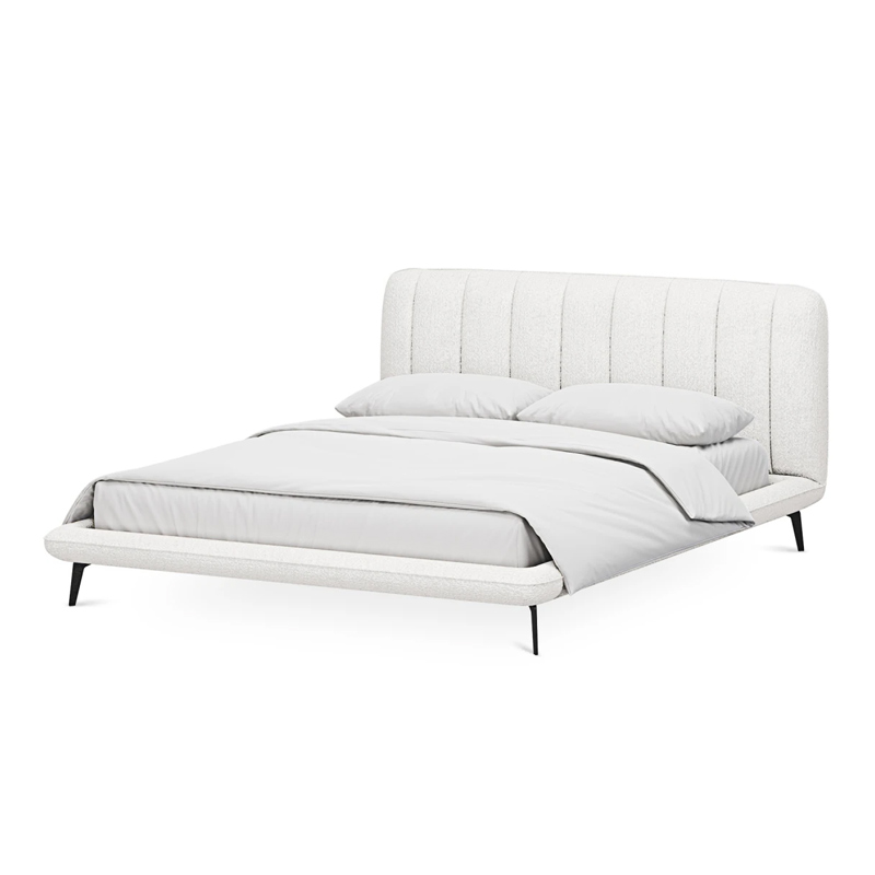 Прочные ножки из металла незаметно приподнимают корпус над полом. Поэтому кровать смотрится воздушно. Также это упрощает уборку. Мягкие изящные царги плавно перетекают в изголовье, единство с которым подчеркивается рельефным кантом.