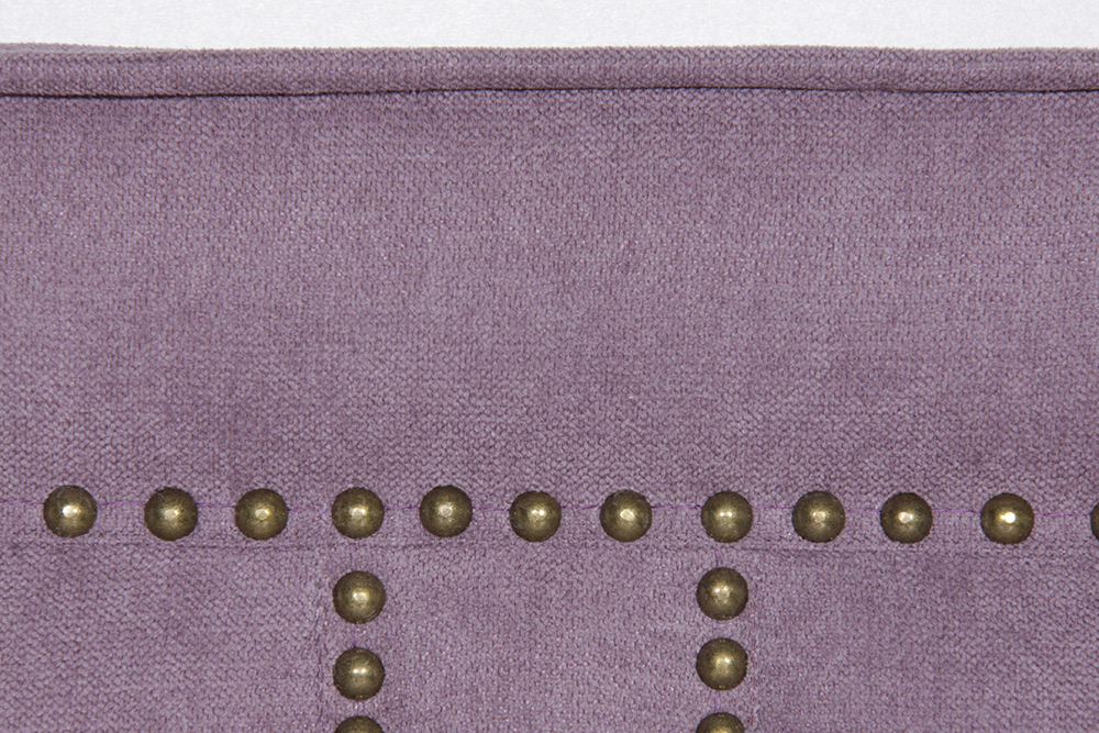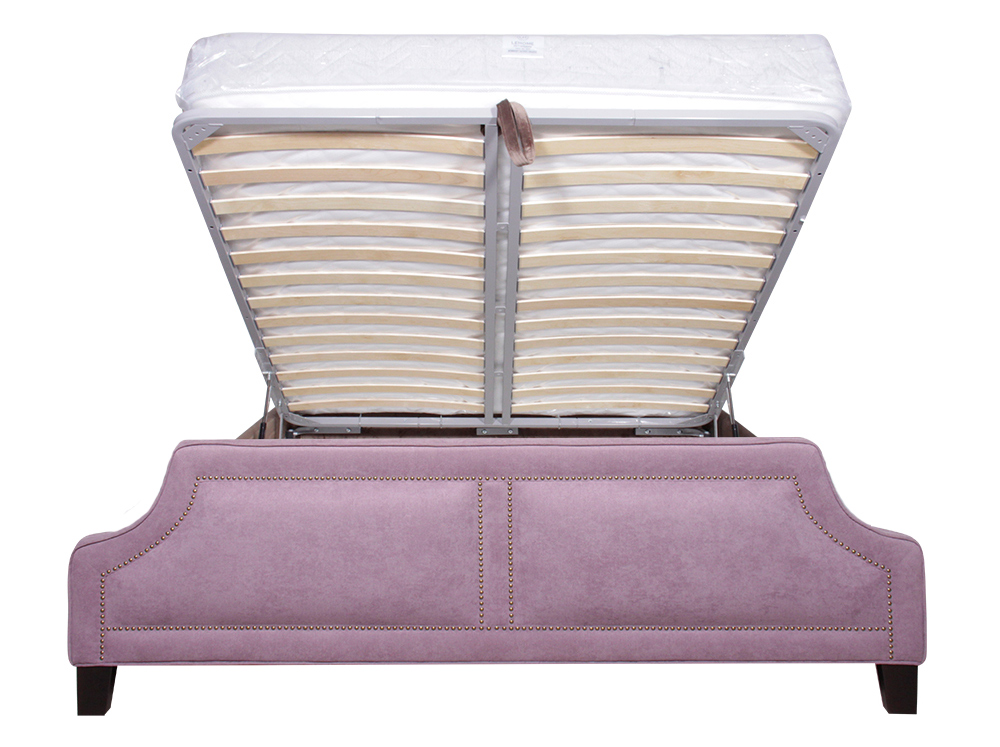 Высокое изголовье и изножье кровати обладают изящной фигурной формой с декоративными заклепками. Деревянные ножки из массива украшают фасадную часть кровати. Обивка кровати представлена в ассортименте и выполняется под заказ. Данный товар выполнен в ткани 3 категории.