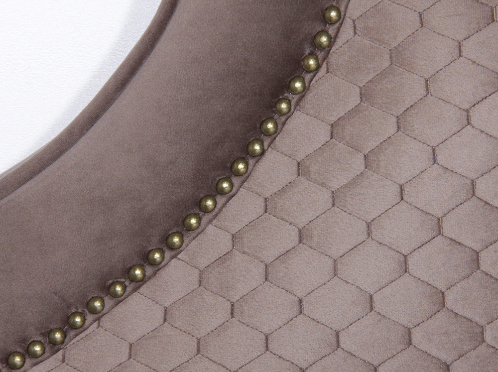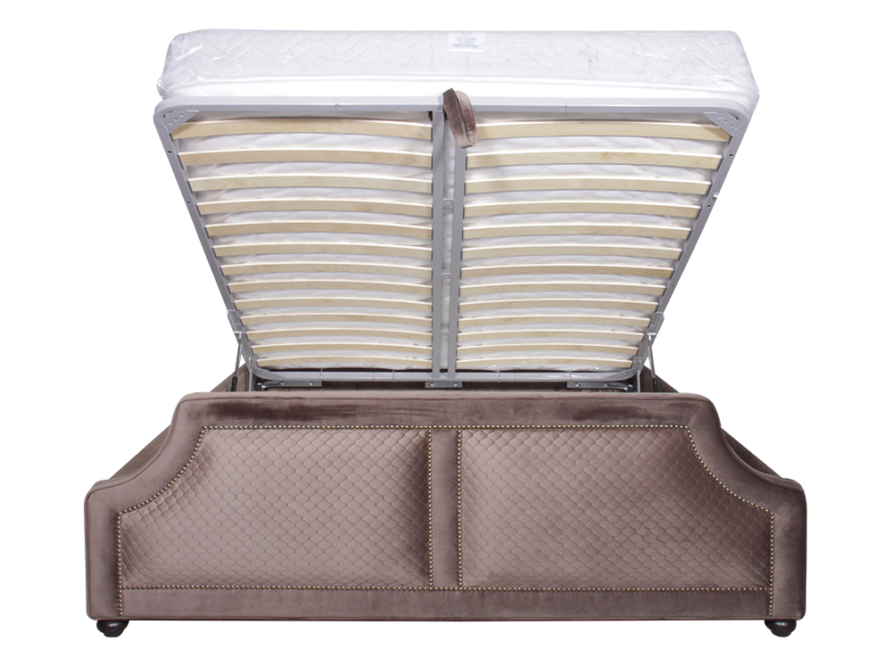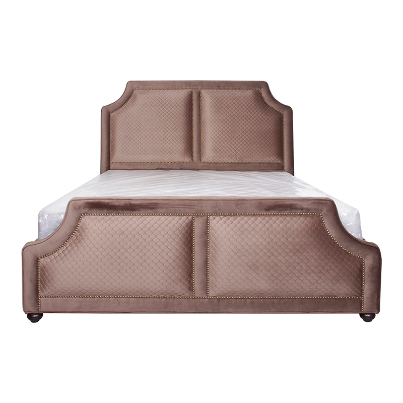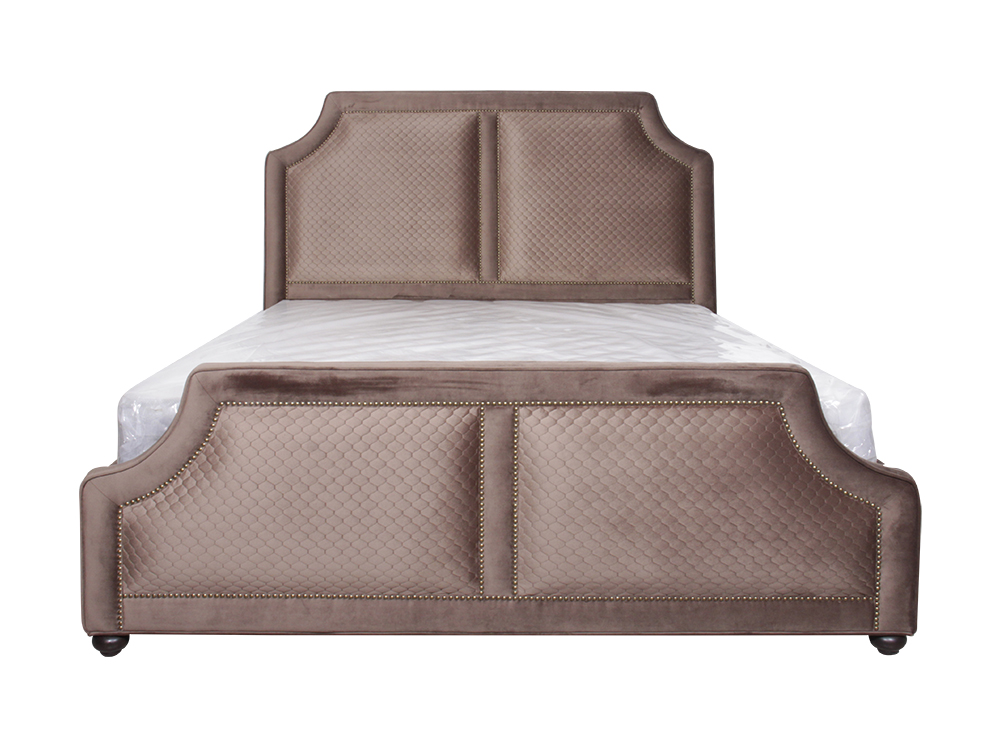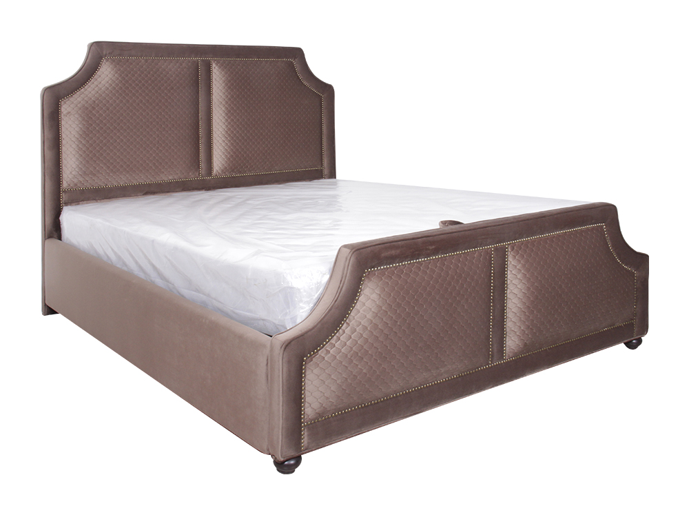 Высокое изголовье и изножье кровати обладают изящной фигурной формой с декоративными заклепками. Деревянные ножки из массива украшают фасадную часть кровати. Обивка кровати представлена в ассортименте и выполняется под заказ. Данный товар выполнен в ткани 4 категории.