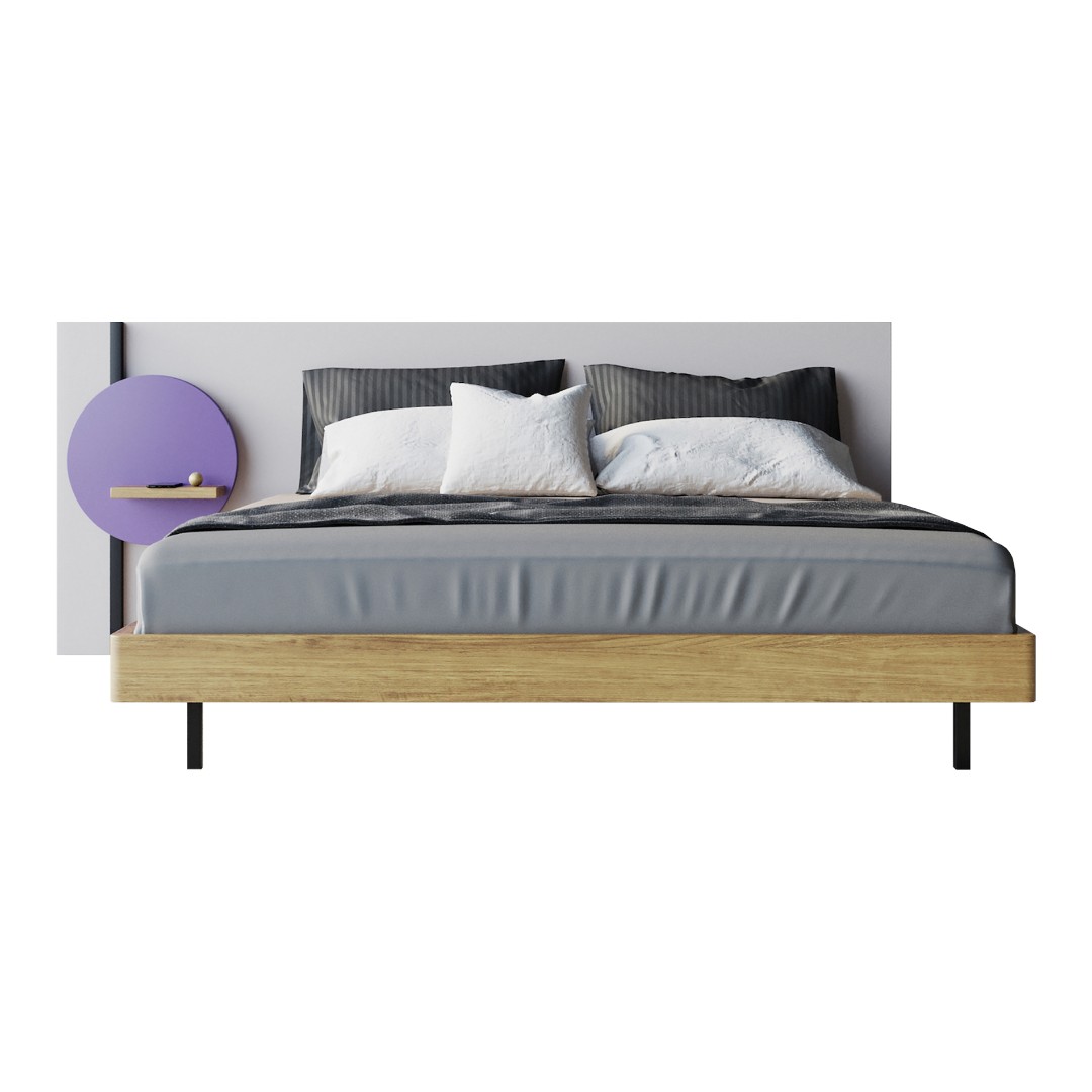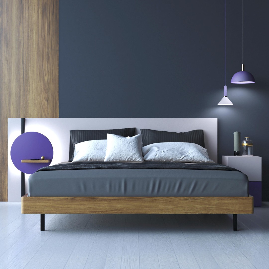 Изголовье мдф с покрытием полуматовой эмалью RAL design 080-90-10/Ral 7047, декоративной панелью из мдф, покрытие полуматовая эмаль RAL design 160-50- 05/ Ral 4005, со светодиодной подсветкой и небольшой полочкой из массива дуба, с покрытием прозрачный полуматовый лак. К светодиодной подсветке прилагается пульт управления.
