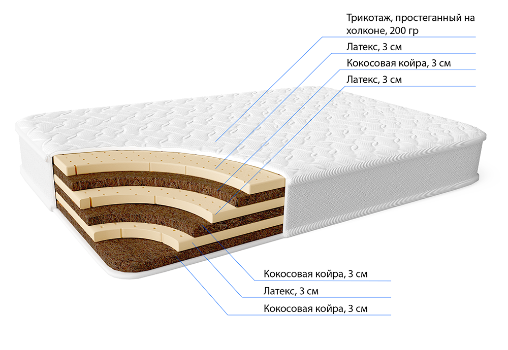 Беспружинный матрас из кокосовой койры и натурального латекса сочетает в себе прочность и комфорт. Кокосовая койра создает жесткость, необходимую для хорошей поддержки, что особенно важно для здорового сна и профилактики проблем с позвоночником. Натуральный латекс придает матрасу упругость и эластичность, позволяя ему идеально подстраиваться под контуры вашего тела. Трикотажный чехол приятно ощущается на коже, а его свойства способствуют отличной циркуляции воздуха. Такой матрас обеспечивает оптимальную поддержку и комфортный микроклимат для сна, что делает его отличным выбором для заботящихся о своем здоровье.
