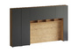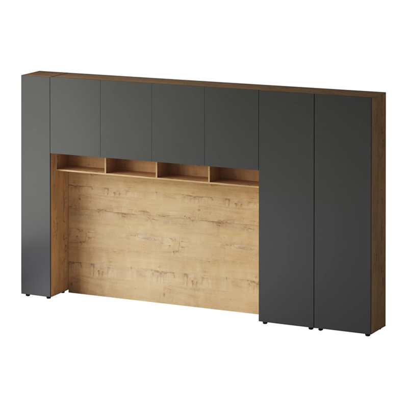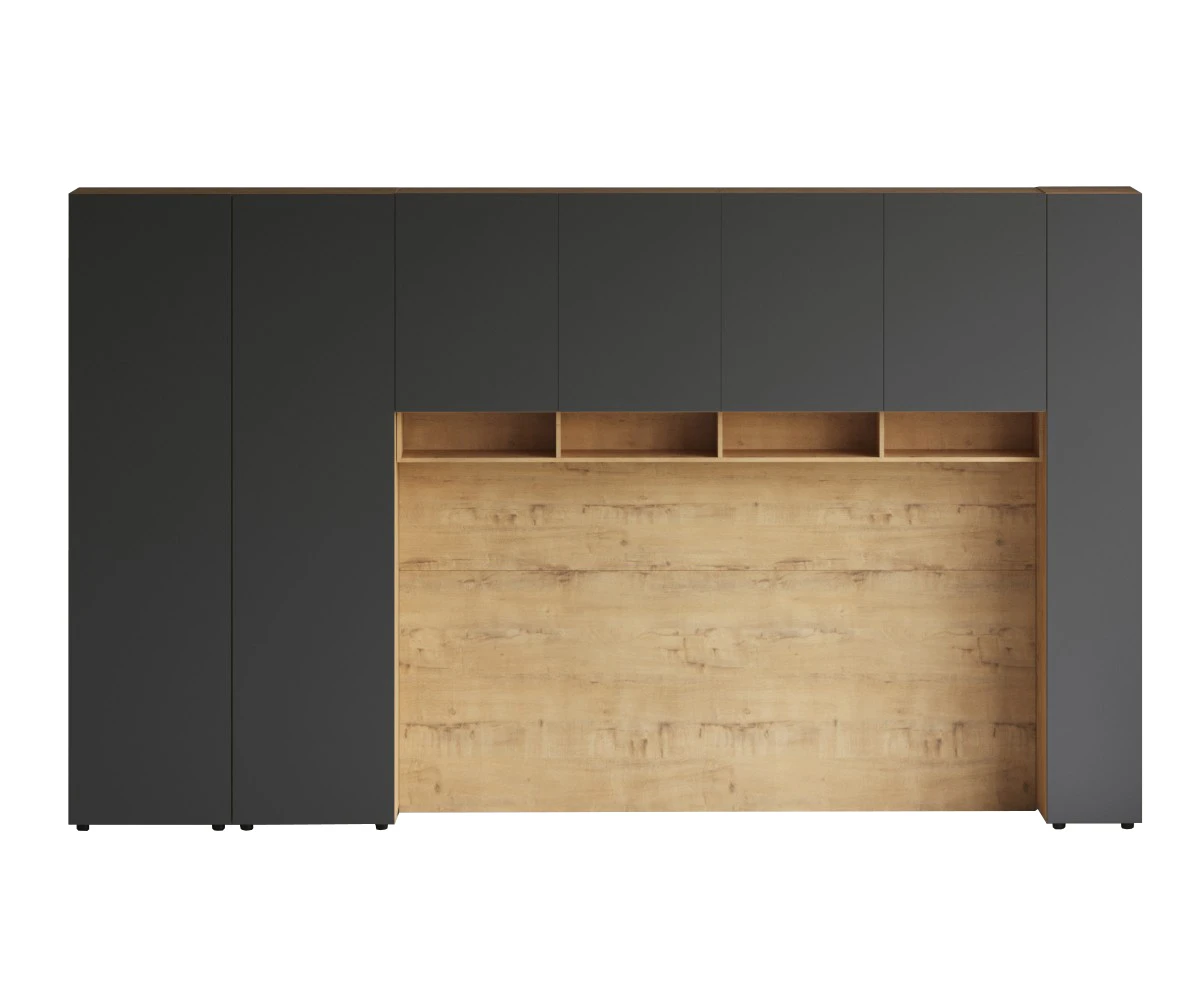 Кроватный блок предназначен для использования совместно с кроватью или диваном. Блок имеет два отделения за откидными дверьми и открытую полку над ними. Двери открываются за кромку, с помощью газовых кронштейнов. Кроватный блок оснащен светодиодным светильником, расположенным на открытой верхней полке. Светильник представляет собой алюминиевый профиль с матовым экраном, внутри которого установлена светодиодная лента. С левой и с правой стороны переднего щита блока установлены выключатели светильника и эл. розетки с разъемами USB А и Type C. Блок установлен на регулируемые опоры.