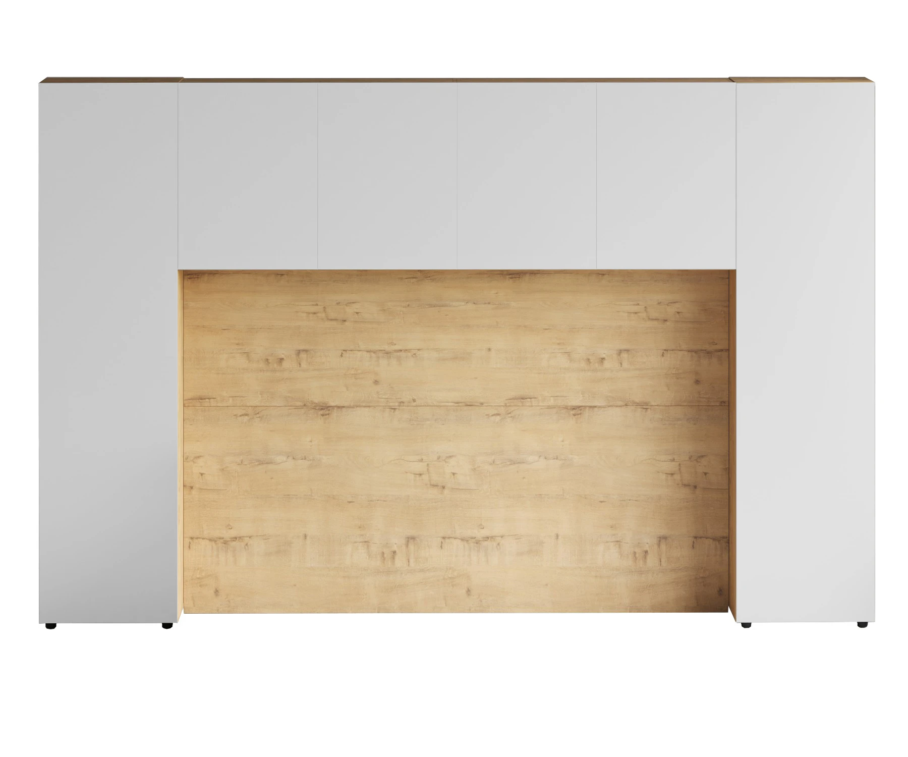 Кроватный блок предназначен для использования совместно с кроватью или диваном. Блок имеет два отделения за откидными дверьми и открытую полку над ними. Двери открываются за кромку, с помощью газовых кронштейнов. Кроватный блок оснащен светодиодным светильником, расположенным на открытой верхней полке. Светильник представляет собой алюминиевый профиль с матовым экраном, внутри которого установлена светодиодная лента. С левой и с правой стороны переднего щита блока установлены выключатели светильника и эл. розетки с разъемами USB А и Type C. Блок установлен на регулируемые опоры.