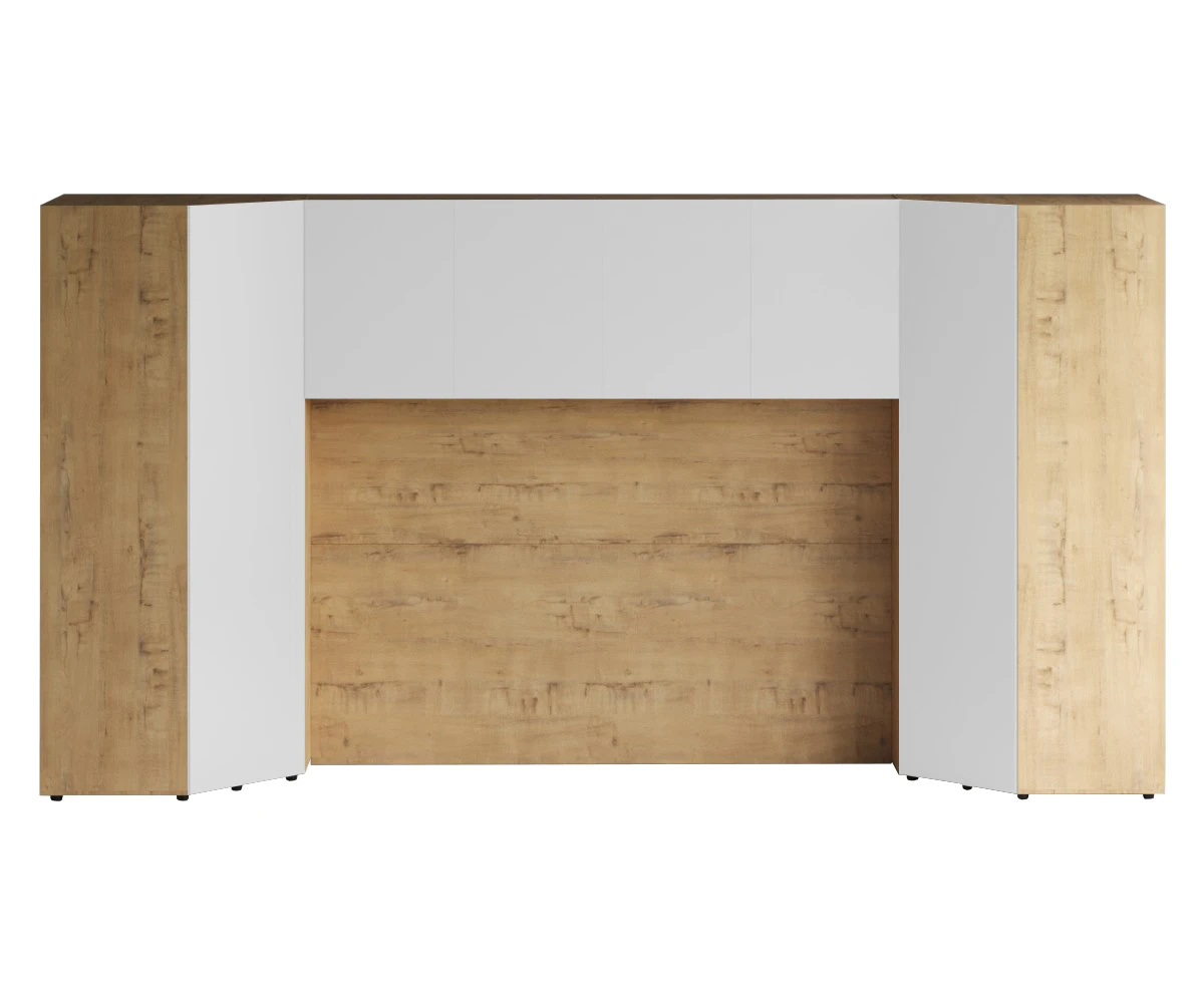 Кроватный блок предназначен для использования совместно с кроватью или диваном. Блок имеет два отделения за откидными дверьми и открытую полку над ними. Двери открываются за кромку, с помощью газовых кронштейнов. Кроватный блок оснащен светодиодным светильником, расположенным на открытой верхней полке. Светильник представляет собой алюминиевый профиль с матовым экраном, внутри которого установлена светодиодная лента. С левой и с правой стороны переднего щита блока установлены выключатели светильника