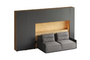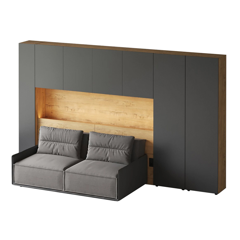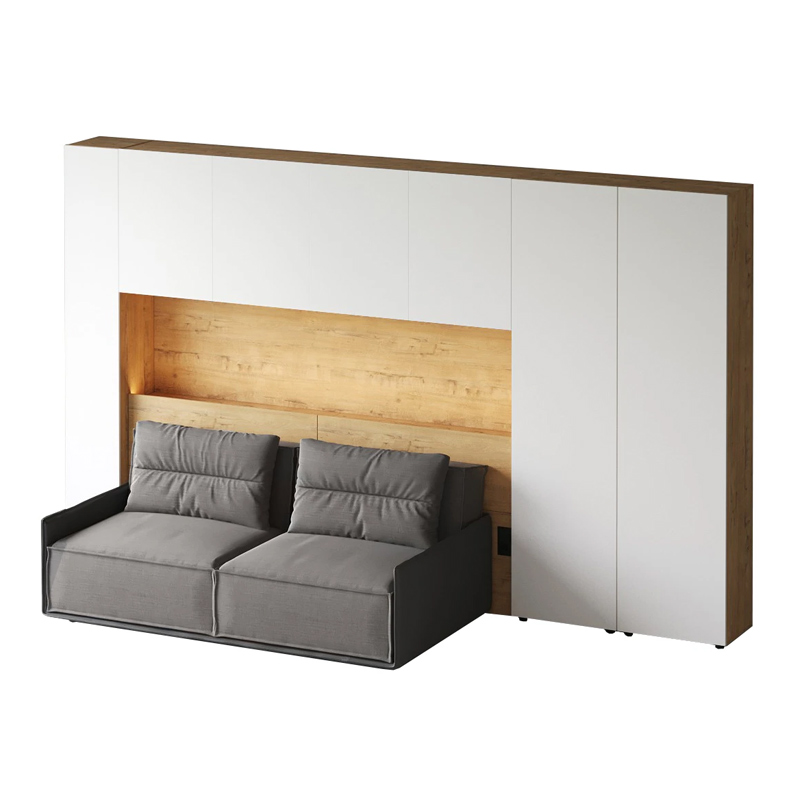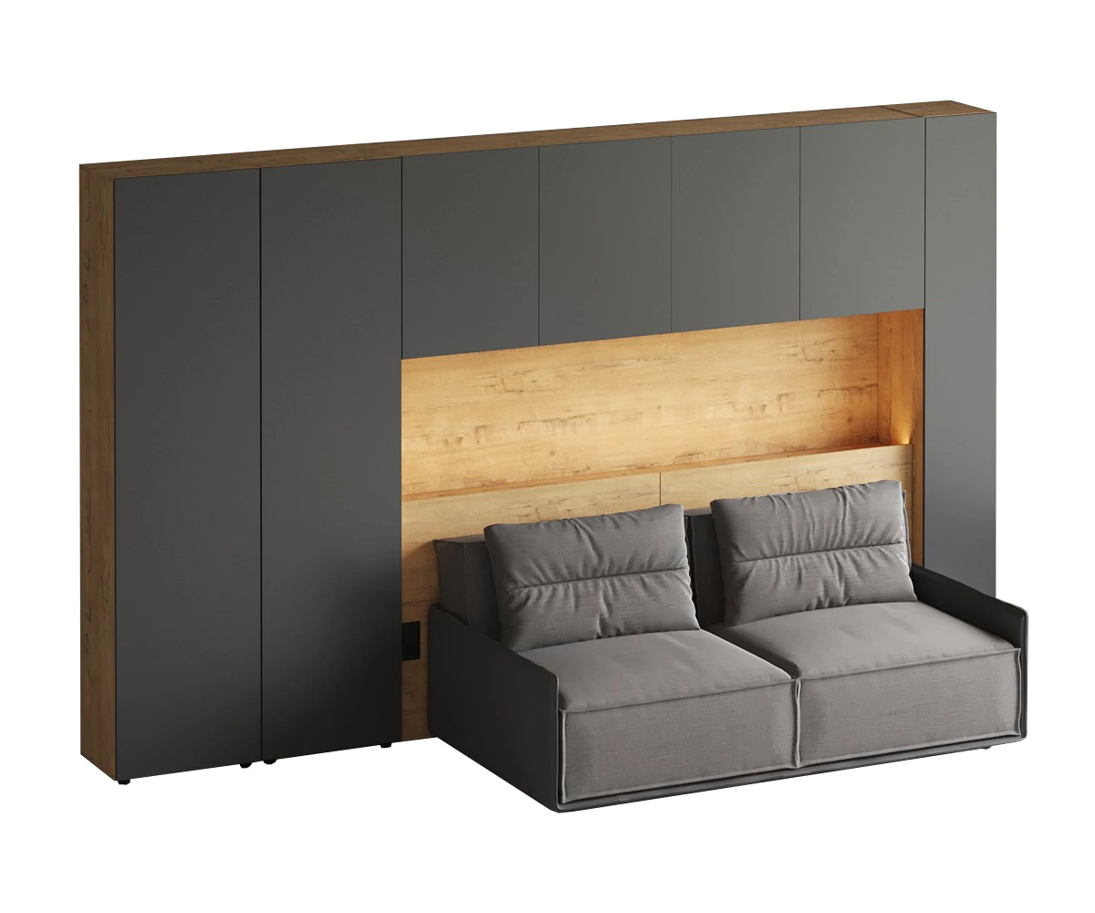 Кроватный блок предназначен для использования совместно с кроватью или диваном. Блок имеет два отделения за откидными дверьми и открытую полку над ними. Двери открываются за кромку, с помощью газовых кронштейнов. Кроватный блок оснащен светодиодным светильником, расположенным на открытой верхней полке. Светильник представляет собой алюминиевый профиль с матовым экраном, внутри которого установлена светодиодная лента. С левой и с правой стороны переднего щита блока установлены выключатели светильника и эл. розетки с разъемами USB А и Type C. Блок установлен на регулируемые опоры.