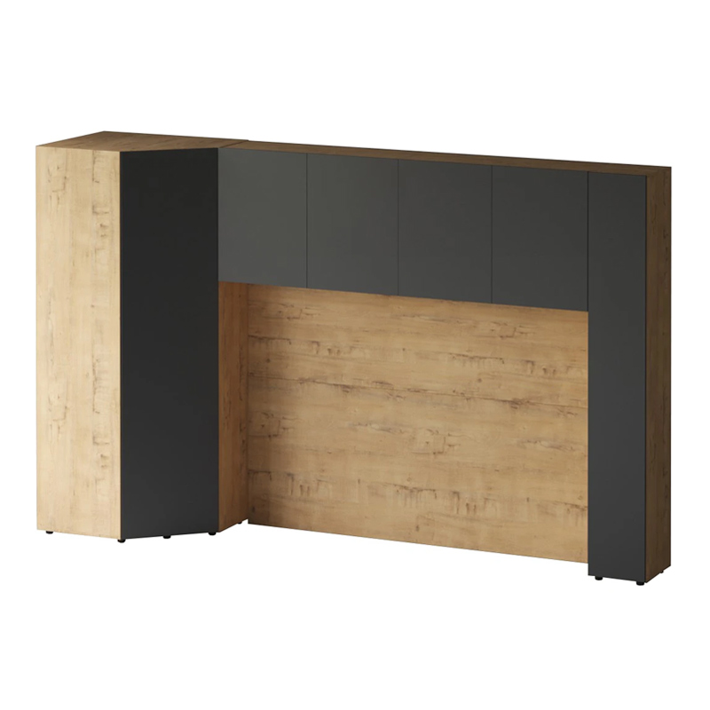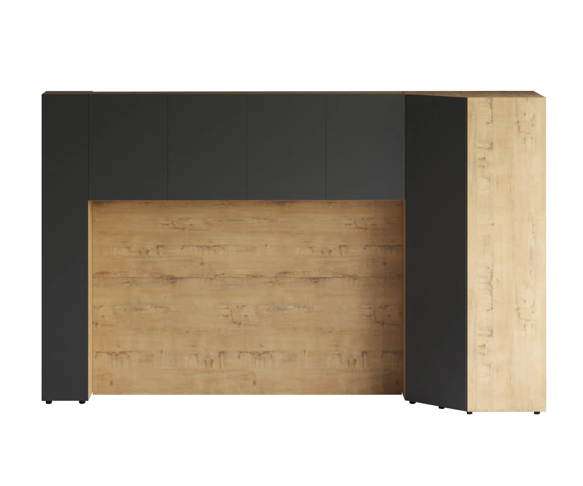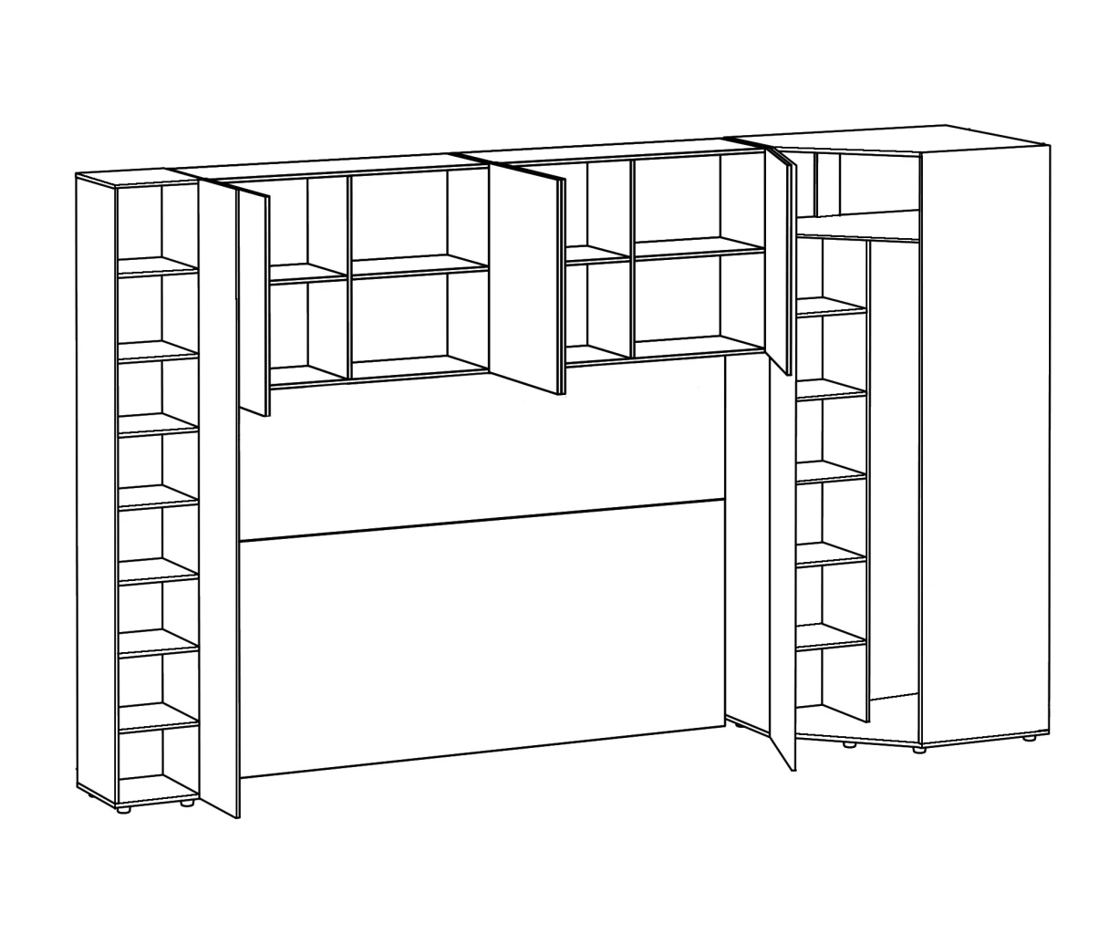 Кроватный блок предназначен для использования совместно с кроватью или диваном. Блок имеет два отделения за откидными дверьми и открытую полку над ними. Двери открываются за кромку, с помощью газовых кронштейнов. Кроватный блок оснащен светодиодным светильником, расположенным на открытой верхней полке. Светильник представляет собой алюминиевый профиль с матовым экраном, внутри которого установлена светодиодная лента. С левой и с правой стороны переднего щита блока установлены выключатели светильника и эл. розетки с разъемами USB А и Type C. Блок установлен на регулируемые опоры.