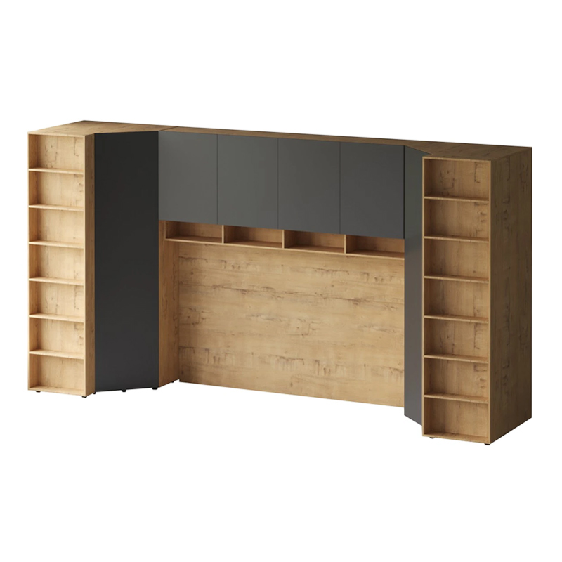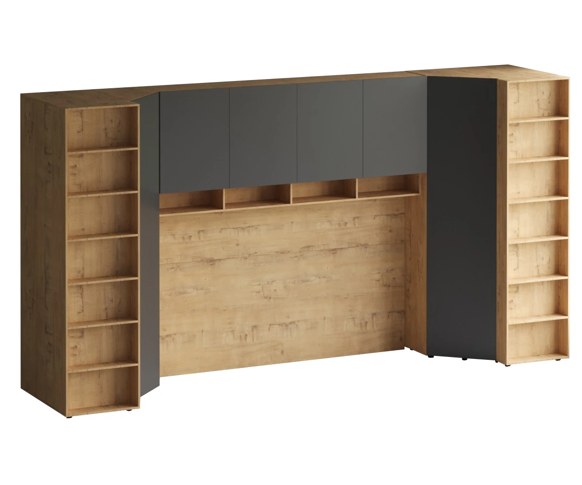 Кроватный блок предназначен для использования совместно с кроватью или диваном. Блок имеет два отделения за откидными дверьми и открытую полку над ними. Двери открываются за кромку, с помощью газовых кронштейнов. Кроватный блок оснащен светодиодным светильником, расположенным на открытой верхней полке. Светильник представляет собой алюминиевый профиль с матовым экраном, внутри которого установлена светодиодная лента. С левой и с правой стороны переднего щита блока установлены выключатели светильника и эл. розетки с разъемами USB А и Type C. Блок установлен на регулируемые опоры.