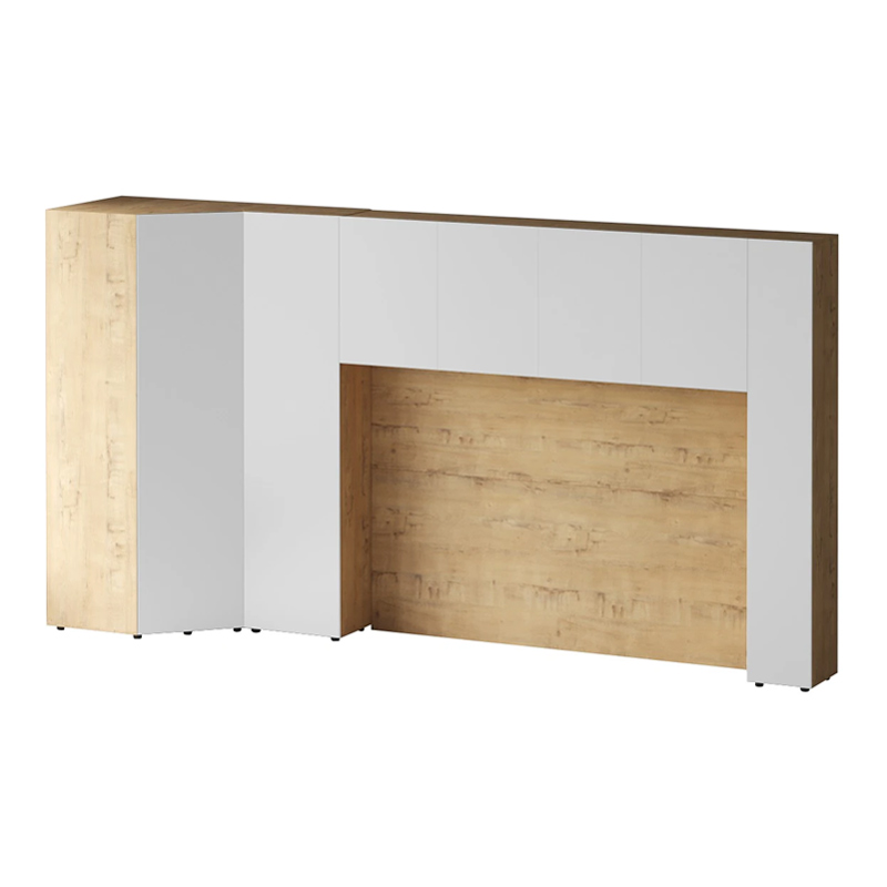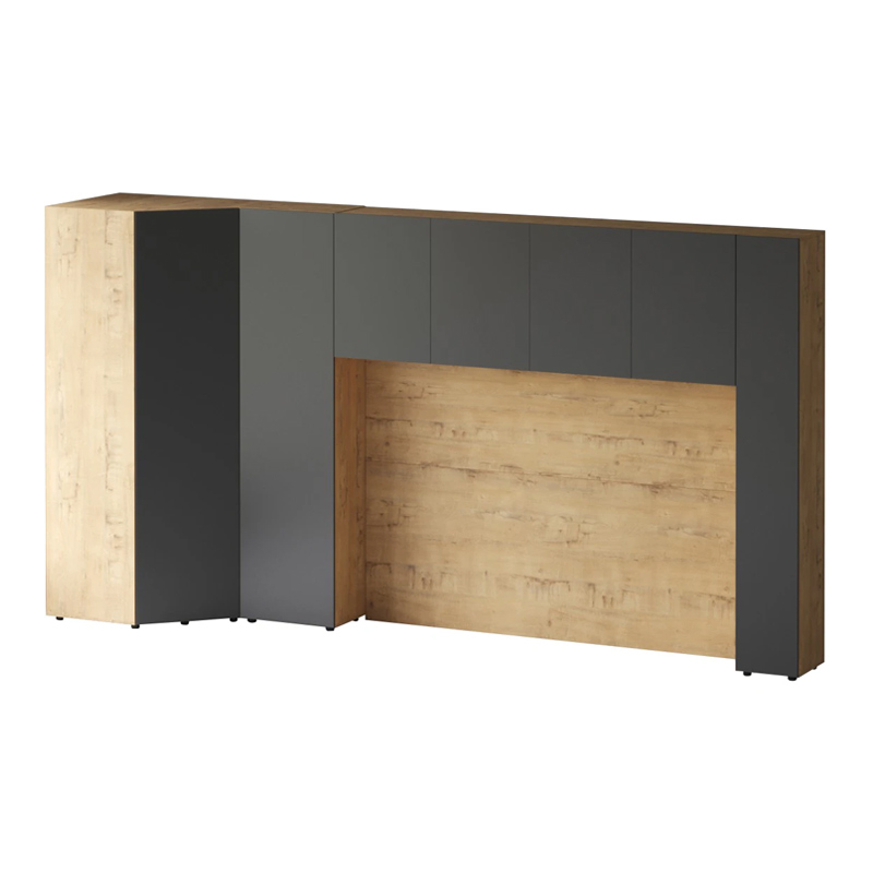 Кроватный блок предназначен для использования совместно с кроватью или диваном. Блок имеет два отделения за откидными дверьми и открытую полку над ними. Двери открываются за кромку, с помощью газовых кронштейнов. Кроватный блок оснащен светодиодным светильником, расположенным на открытой верхней полке. Светильник представляет собой алюминиевый профиль с матовым экраном, внутри которого установлена светодиодная лента. С левой и с правой стороны переднего щита блока установлены выключатели светильника и эл. розетки с разъемами USB А и Type C. Блок установлен на регулируемые опоры.