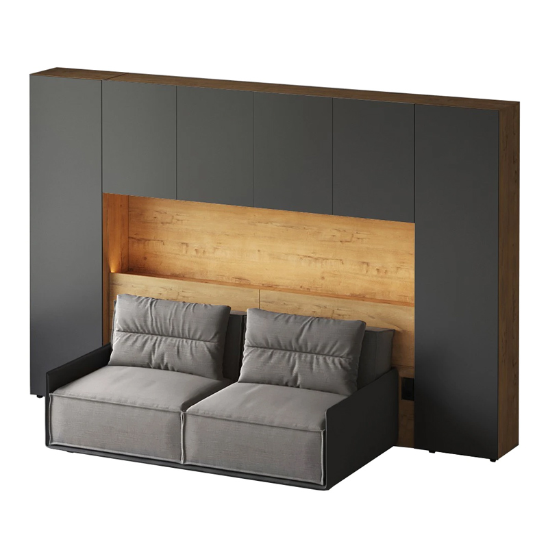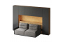 Кроватный блок предназначен для использования совместно с кроватью или диваном. Блок имеет два отделения за откидными дверьми и открытую полку над ними. Двери открываются за кромку, с помощью газовых кронштейнов. Кроватный блок оснащен светодиодным светильником, расположенным на открытой верхней полке. Светильник представляет собой алюминиевый профиль с матовым экраном, внутри которого установлена светодиодная лента. С левой и с правой стороны переднего щита блока установлены выключатели светильника и эл. розетки с разъемами USB А и Type C. Блок установлен на регулируемые опоры.