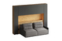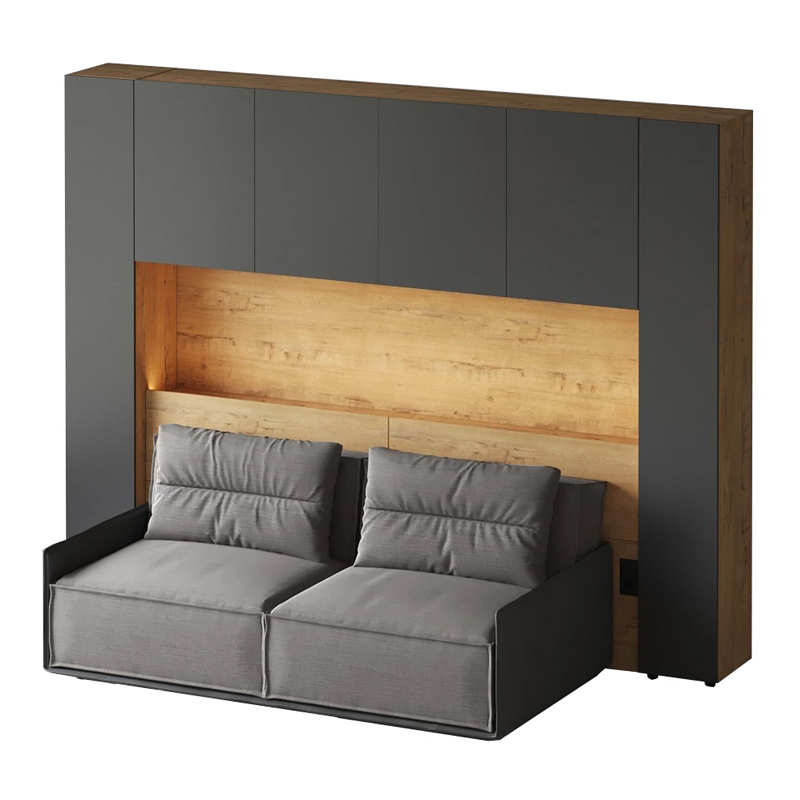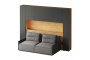 Кроватный блок предназначен для использования совместно с кроватью или диваном. Блок имеет два отделения за откидными дверьми и открытую полку над ними. Двери открываются за кромку, с помощью газовых кронштейнов. Кроватный блок оснащен светодиодным светильником, расположенным на открытой верхней полке. Светильник представляет собой алюминиевый профиль с матовым экраном, внутри которого установлена светодиодная лента. С левой и с правой стороны переднего щита блока установлены выключатели светильника и эл. розетки с разъемами USB А и Type C. Блок установлен на регулируемые опоры.