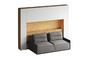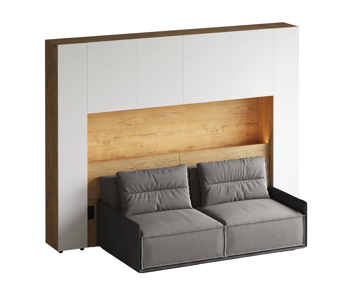Кроватный блок предназначен для использования совместно с кроватью или диваном. Блок имеет два отделения за откидными дверьми и открытую полку над ними. Двери открываются за кромку, с помощью газовых кронштейнов. Кроватный блок оснащен светодиодным светильником, расположенным на открытой верхней полке. Светильник представляет собой алюминиевый профиль с матовым экраном, внутри которого установлена светодиодная лента. С левой и с правой стороны переднего щита блока установлены выключатели светильника и эл. розетки с разъемами USB А и Type C. Блок установлен на регулируемые опоры.