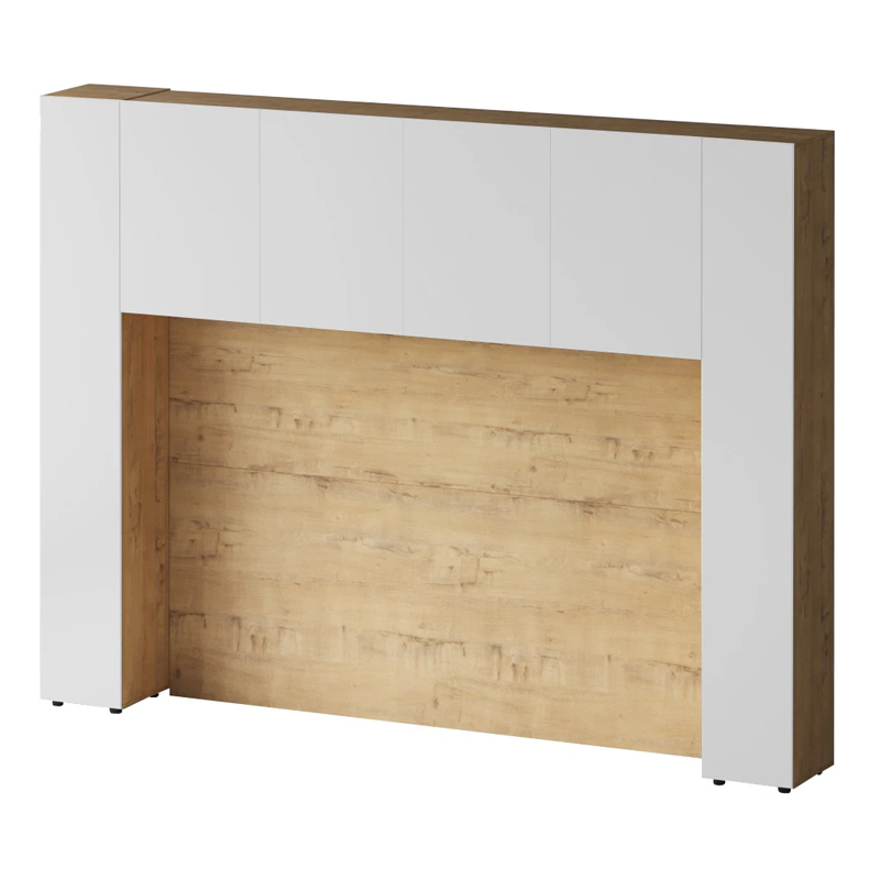 Кроватный блок предназначен для использования совместно с кроватью или диваном. Блок имеет два отделения за откидными дверьми и открытую полку над ними. Двери открываются за кромку, с помощью газовых кронштейнов. Кроватный блок оснащен светодиодным светильником, расположенным на открытой верхней полке. Светильник представляет собой алюминиевый профиль с матовым экраном, внутри которого установлена светодиодная лента. С левой и с правой стороны переднего щита блока установлены выключатели светильника и эл. розетки с разъемами USB А и Type C. Блок установлен на регулируемые опоры.