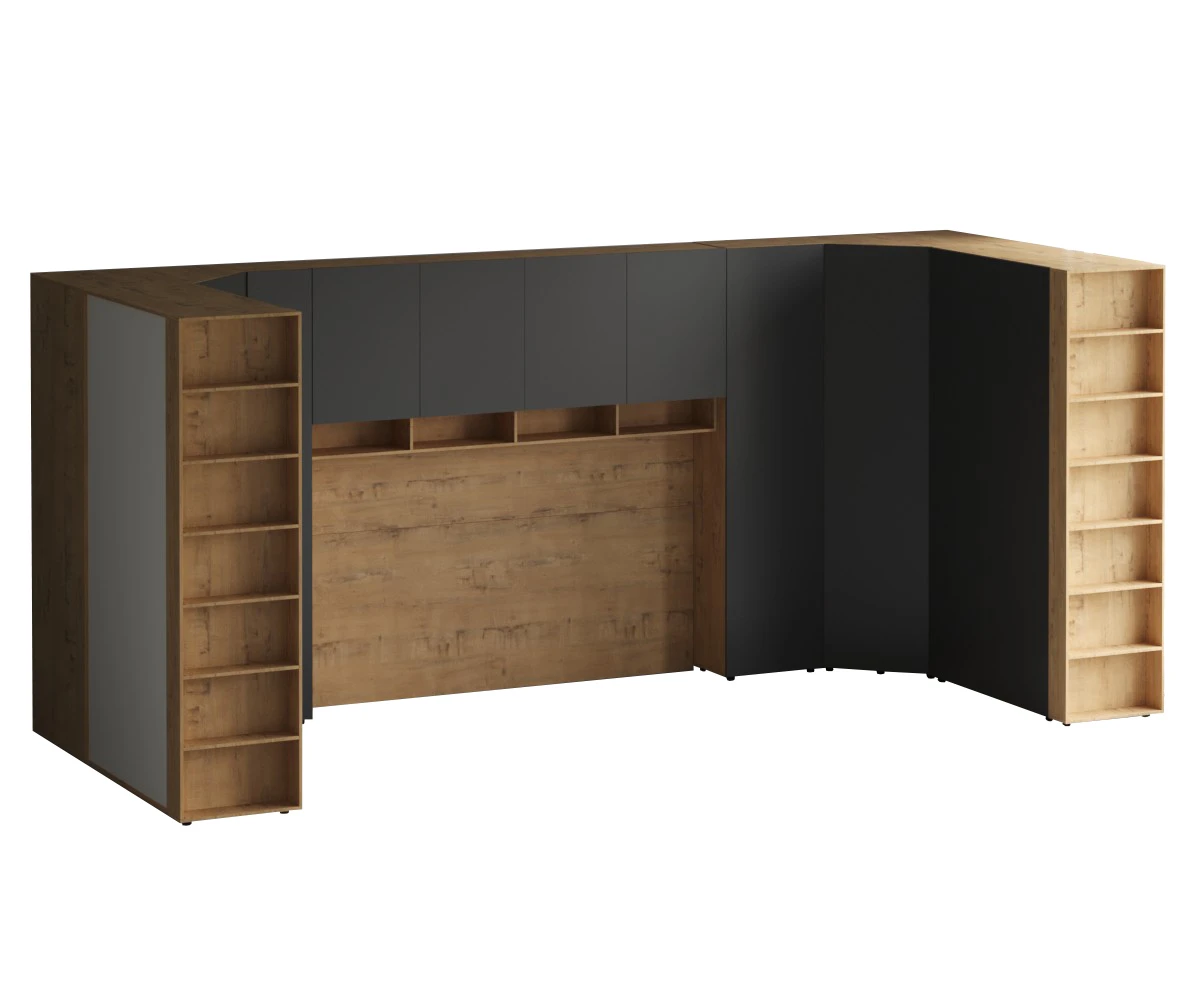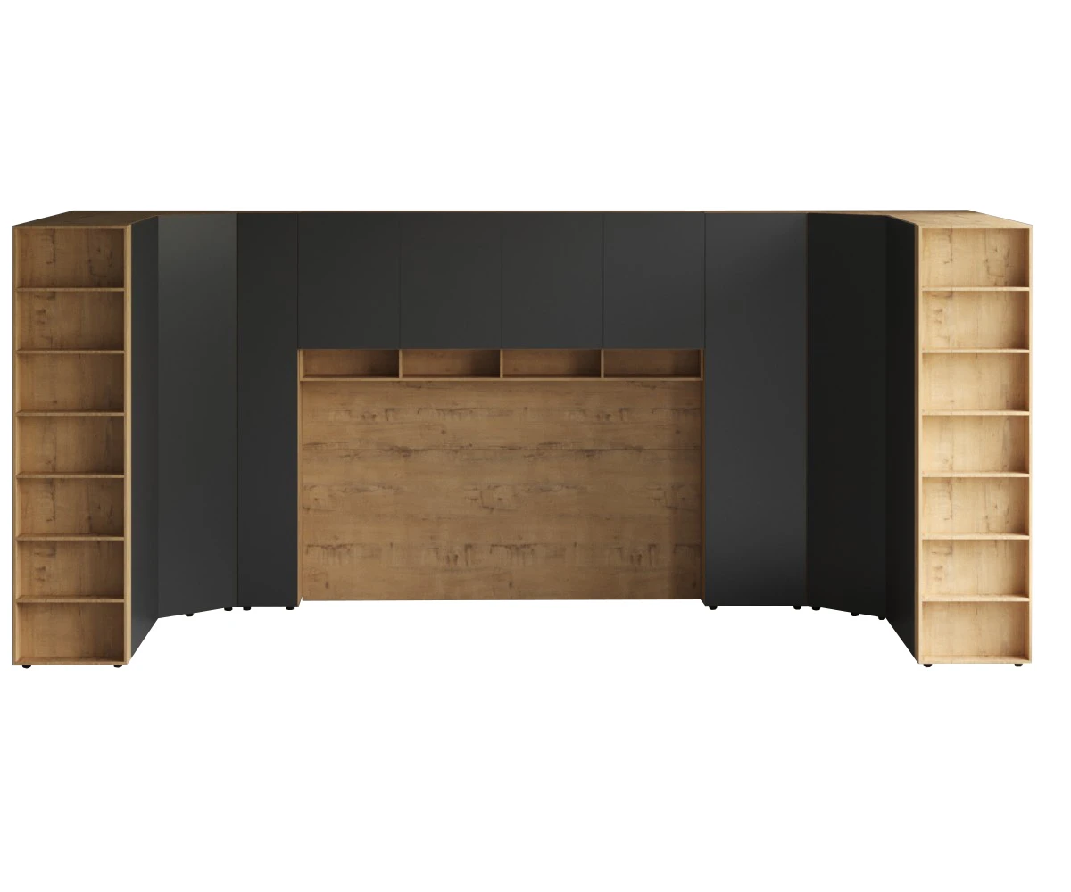 Кроватный блок предназначен для использования совместно с кроватью или диваном. Блок имеет два отделения за откидными дверьми и открытую полку над ними. Двери открываются за кромку, с помощью газовых кронштейнов. Кроватный блок оснащен светодиодным светильником, расположенным на открытой верхней полке. Светильник представляет собой алюминиевый профиль с матовым экраном, внутри которого установлена светодиодная лента. С левой и с правой стороны переднего щита блока установлены выключатели светильника и эл. розетки с разъемами USB А и Type C. Блок установлен на регулируемые опоры.