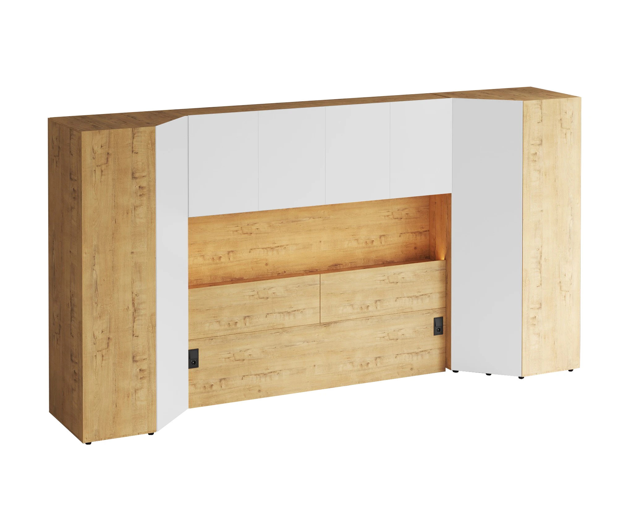 Кроватный блок предназначен для использования совместно с кроватью или диваном. Блок имеет два отделения за откидными дверьми и открытую полку над ними. Двери открываются за кромку, с помощью газовых кронштейнов. Кроватный блок оснащен светодиодным светильником, расположенным на открытой верхней полке. Светильник представляет собой алюминиевый профиль с матовым экраном, внутри которого установлена светодиодная лента. С левой и с правой стороны переднего щита блока установлены выключатели светильника и эл. розетки с разъемами USB А и Type C. Блок установлен на регулируемые опоры.