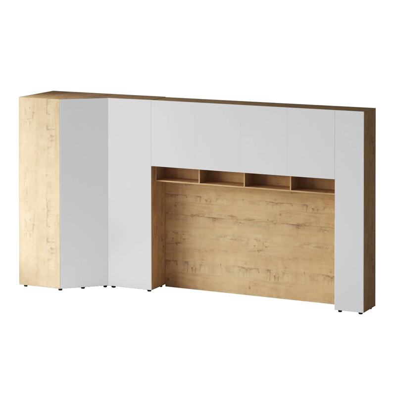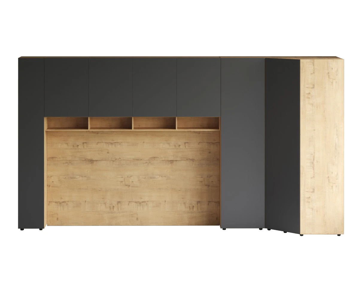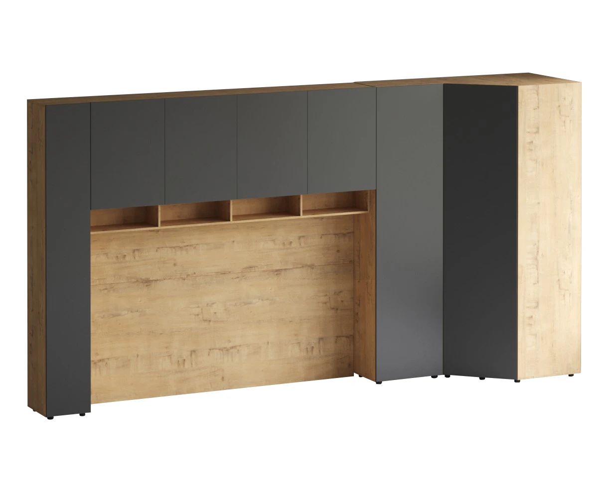 Кроватный блок предназначен для использования совместно с кроватью или диваном. Блок имеет два отделения за откидными дверьми и открытую полку над ними. Двери открываются за кромку, с помощью газовых кронштейнов. Кроватный блок оснащен светодиодным светильником, расположенным на открытой верхней полке. Светильник представляет собой алюминиевый профиль с матовым экраном, внутри которого установлена светодиодная лента. С левой и с правой стороны переднего щита блока установлены выключатели светильника и эл. розетки с разъемами USB А и Type C. Блок установлен на регулируемые опоры.