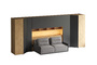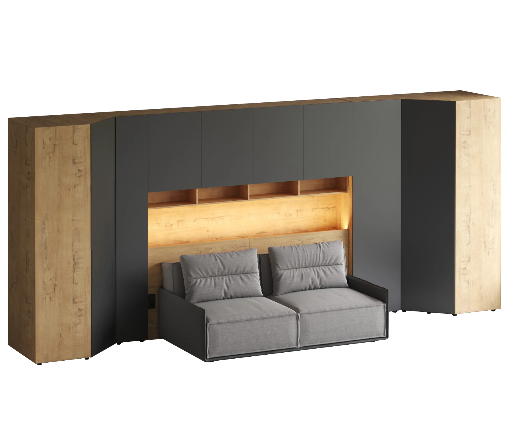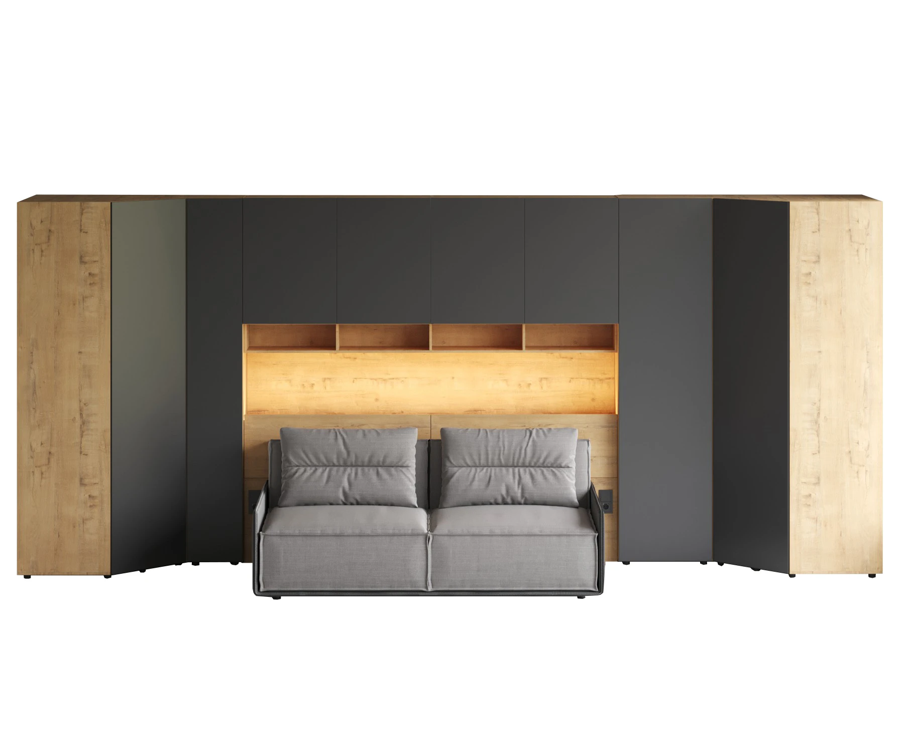 Кроватный блок предназначен для использования совместно с кроватью или диваном. Блок имеет два отделения за откидными дверьми и открытую полку над ними. Двери открываются за кромку, с помощью газовых кронштейнов. Кроватный блок оснащен светодиодным светильником, расположенным на открытой верхней полке. Светильник представляет собой алюминиевый профиль с матовым экраном, внутри которого установлена светодиодная лента. С левой и с правой стороны переднего щита блока установлены выключатели светильника и эл. розетки с разъемами USB А и Type C. Блок установлен на регулируемые опоры.