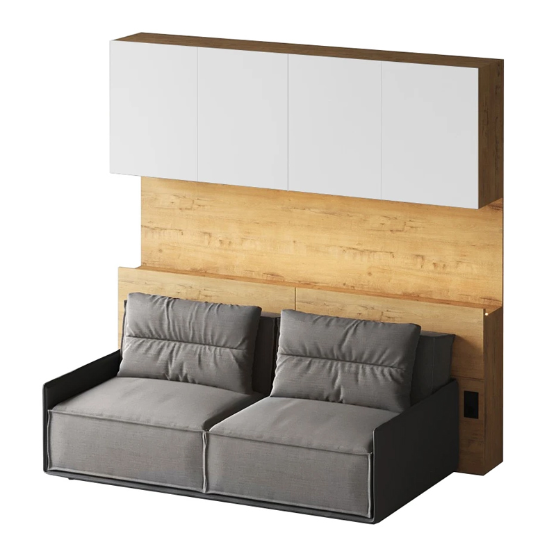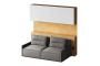 Кроватный блок предназначен для использования совместно с кроватью или диваном. Блок имеет два отделения за откидными дверьми и открытую полку над ними. Двери открываются за кромку, с помощью газовых кронштейнов. Кроватный блок оснащен светодиодным светильником, расположенным на открытой верхней полке. Светильник представляет собой алюминиевый профиль с матовым экраном, внутри которого установлена светодиодная лента. С левой и с правой стороны переднего щита блока установлены выключатели светильника и эл. розетки с разъемами USB А и Type C. Блок установлен на регулируемые опоры.