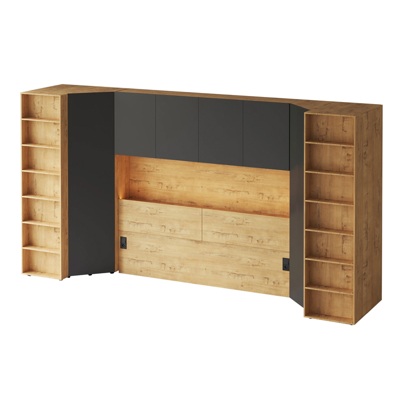 Кроватный блок предназначен для использования совместно с кроватью или диваном. Блок имеет два отделения за откидными дверьми и открытую полку над ними. Двери открываются за кромку, с помощью газовых кронштейнов. Кроватный блок оснащен светодиодным светильником, расположенным на открытой верхней полке. Светильник представляет собой алюминиевый профиль с матовым экраном, внутри которого установлена светодиодная лента. С левой и с правой стороны переднего щита блока установлены выключатели светильника и эл. розетки с разъемами USB А и Type C. Блок установлен на регулируемые опоры.