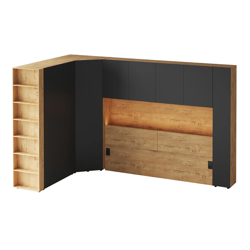 Кроватный блок предназначен для использования совместно с кроватью или диваном. Блок имеет два отделения за откидными дверьми и открытую полку над ними. Двери открываются за кромку, с помощью газовых кронштейнов. Кроватный блок оснащен светодиодным светильником, расположенным на открытой верхней полке. Светильник представляет собой алюминиевый профиль с матовым экраном, внутри которого установлена светодиодная лента. С левой и с правой стороны переднего щита блока установлены выключатели светильника и эл. розетки с разъемами USB А и Type C. Блок установлен на регулируемые опоры.