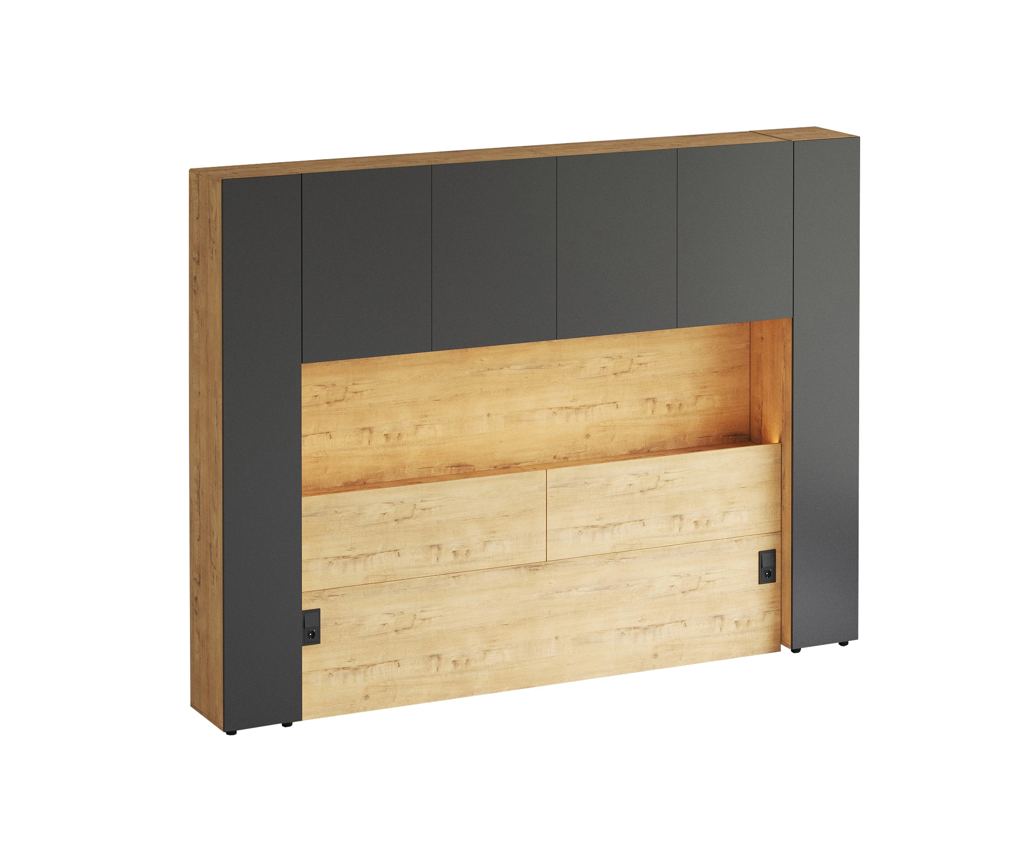 Кроватный блок предназначен для использования совместно с кроватью или диваном. Блок имеет два отделения за откидными дверьми и открытую полку над ними. Двери открываются за кромку, с помощью газовых кронштейнов. Кроватный блок оснащен светодиодным светильником, расположенным на открытой верхней полке. Светильник представляет собой алюминиевый профиль с матовым экраном, внутри которого установлена светодиодная лента. С левой и с правой стороны переднего щита блока установлены выключатели светильника и эл. розетки с разъемами USB А и Type C. Блок установлен на регулируемые опоры.