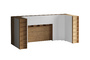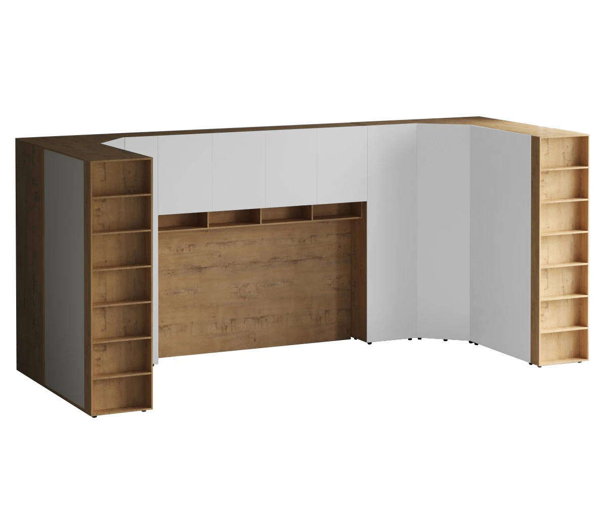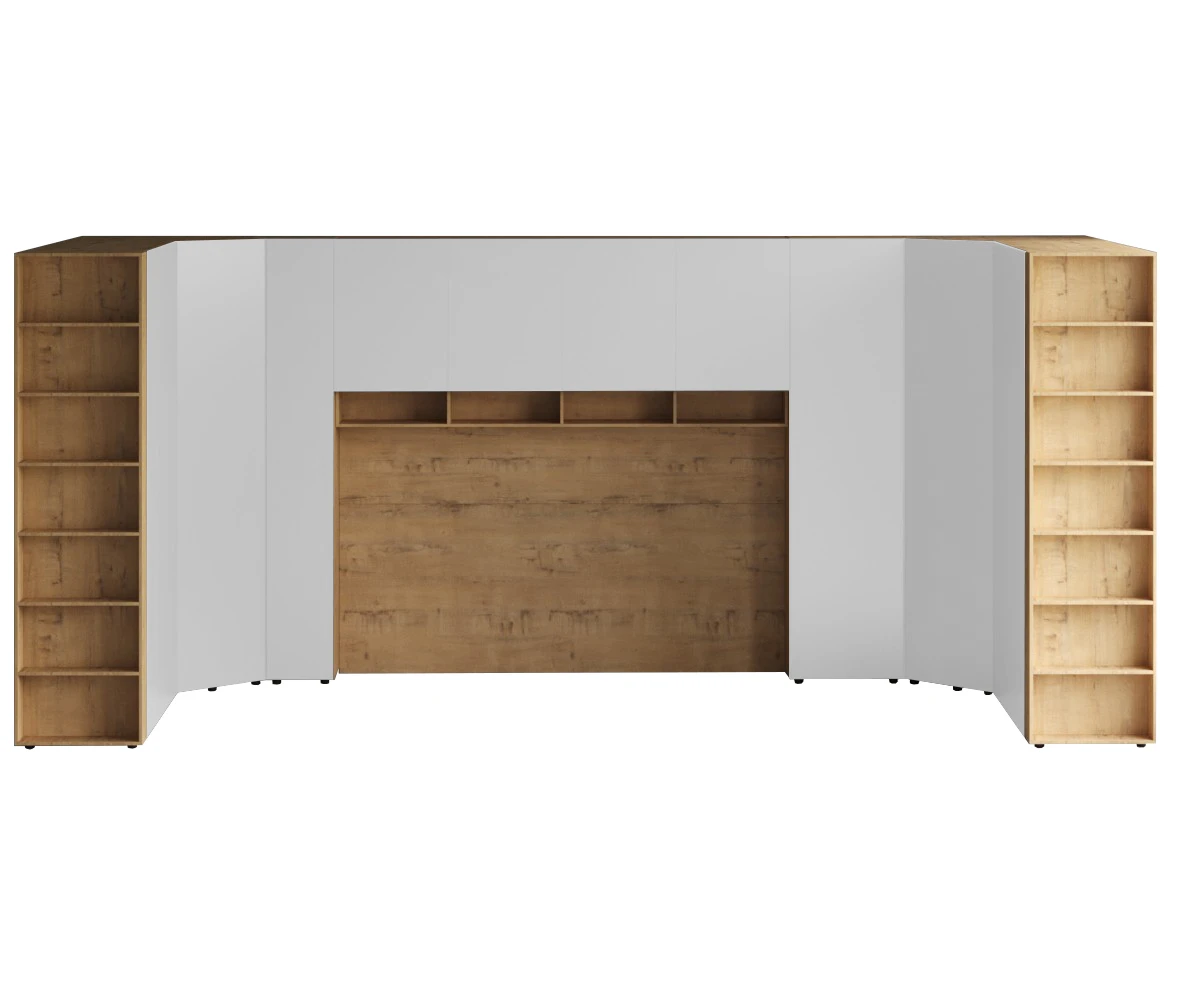 Кроватный блок предназначен для использования совместно с кроватью или диваном. Блок имеет два отделения за откидными дверьми и открытую полку над ними. Двери открываются за кромку, с помощью газовых кронштейнов. Кроватный блок оснащен светодиодным светильником, расположенным на открытой верхней полке. Светильник представляет собой алюминиевый профиль с матовым экраном, внутри которого установлена светодиодная лента. С левой и с правой стороны переднего щита блока установлены выключатели светильника и эл. розетки с разъемами USB А и Type C. Блок установлен на регулируемые опоры.