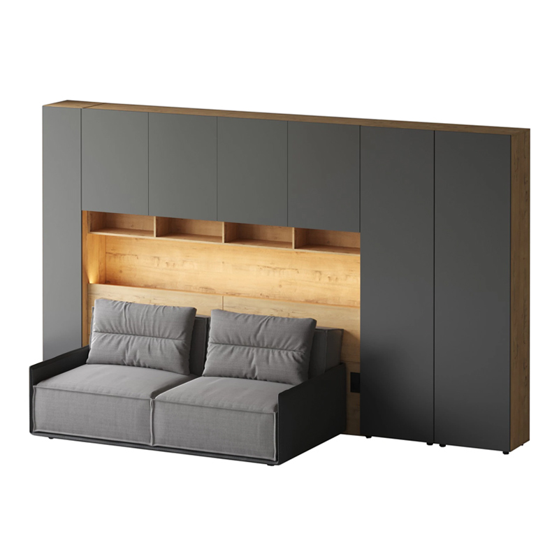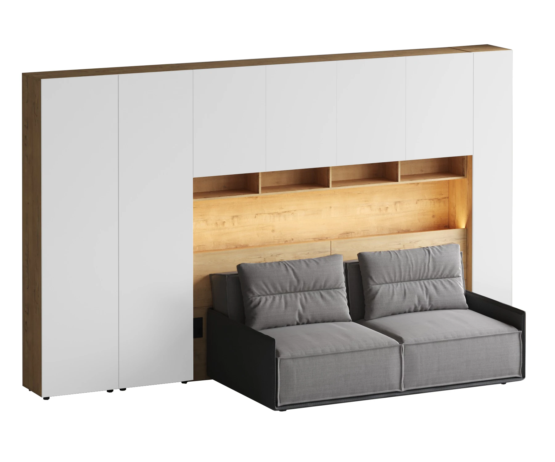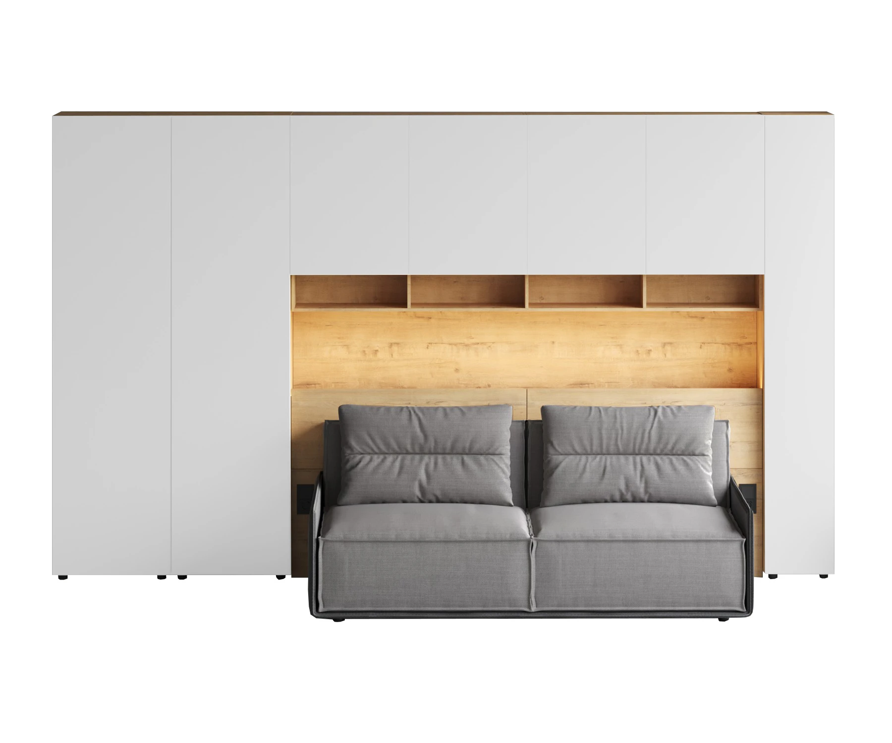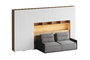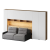 Кроватный блок предназначен для использования совместно с кроватью или диваном. Блок имеет два отделения за откидными дверьми и открытую полку над ними. Двери открываются за кромку, с помощью газовых кронштейнов. Кроватный блок оснащен светодиодным светильником, расположенным на открытой верхней полке. Светильник представляет собой алюминиевый профиль с матовым экраном, внутри которого установлена светодиодная лента. С левой и с правой стороны переднего щита блока установлены выключатели светильника и эл. розетки с разъемами USB А и Type C. Блок установлен на регулируемые опоры.