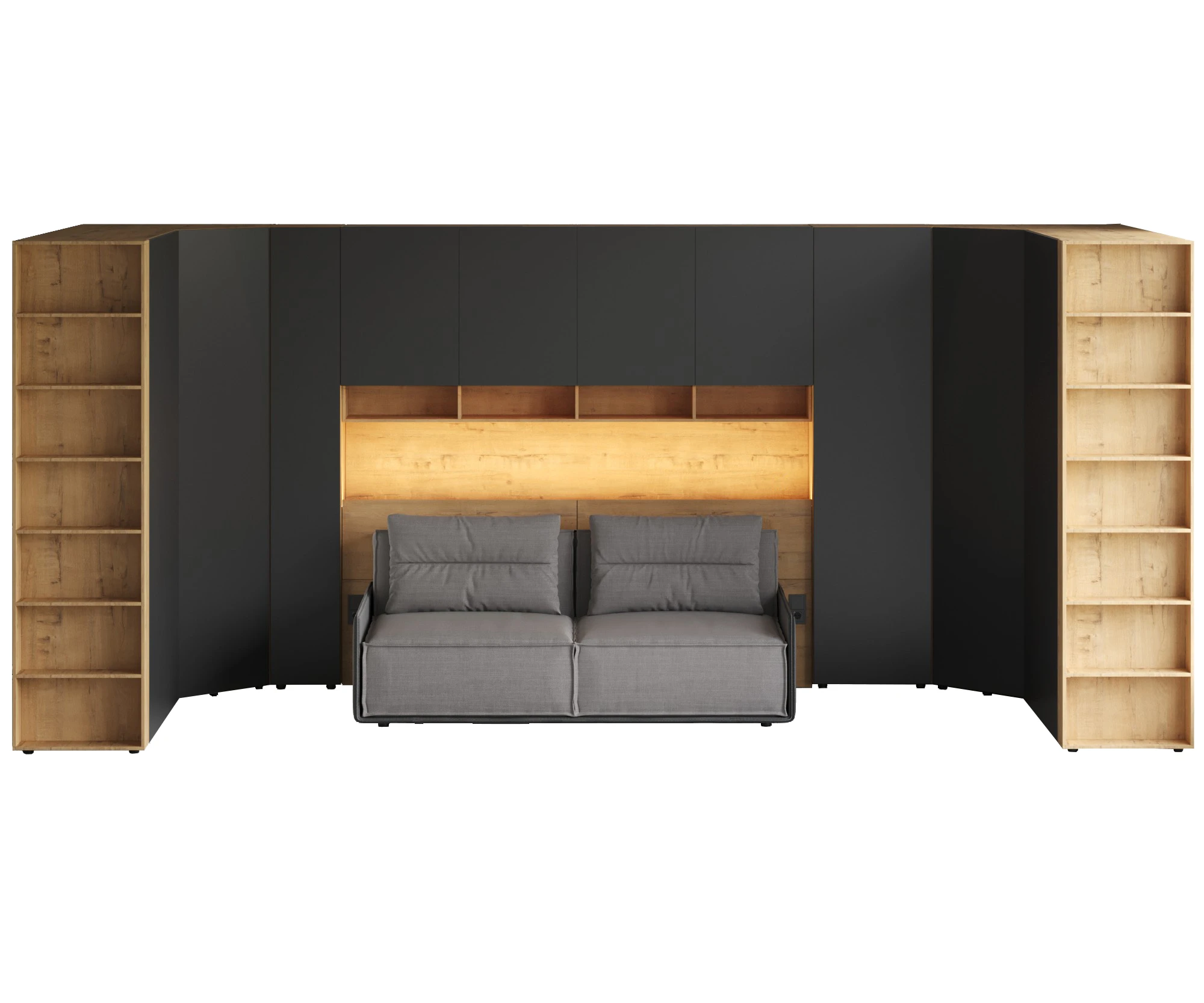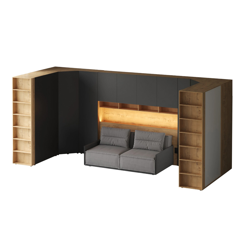 Кроватный блок предназначен для использования совместно с кроватью или диваном. Блок имеет два отделения за откидными дверьми и открытую полку над ними. Двери открываются за кромку, с помощью газовых кронштейнов. Кроватный блок оснащен светодиодным светильником, расположенным на открытой верхней полке. Светильник представляет собой алюминиевый профиль с матовым экраном, внутри которого установлена светодиодная лента. С левой и с правой стороны переднего щита блока установлены выключатели светильника и эл. розетки с разъемами USB А и Type C. Блок установлен на регулируемые опоры.