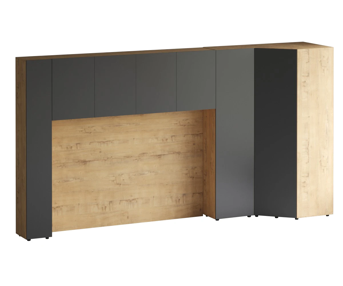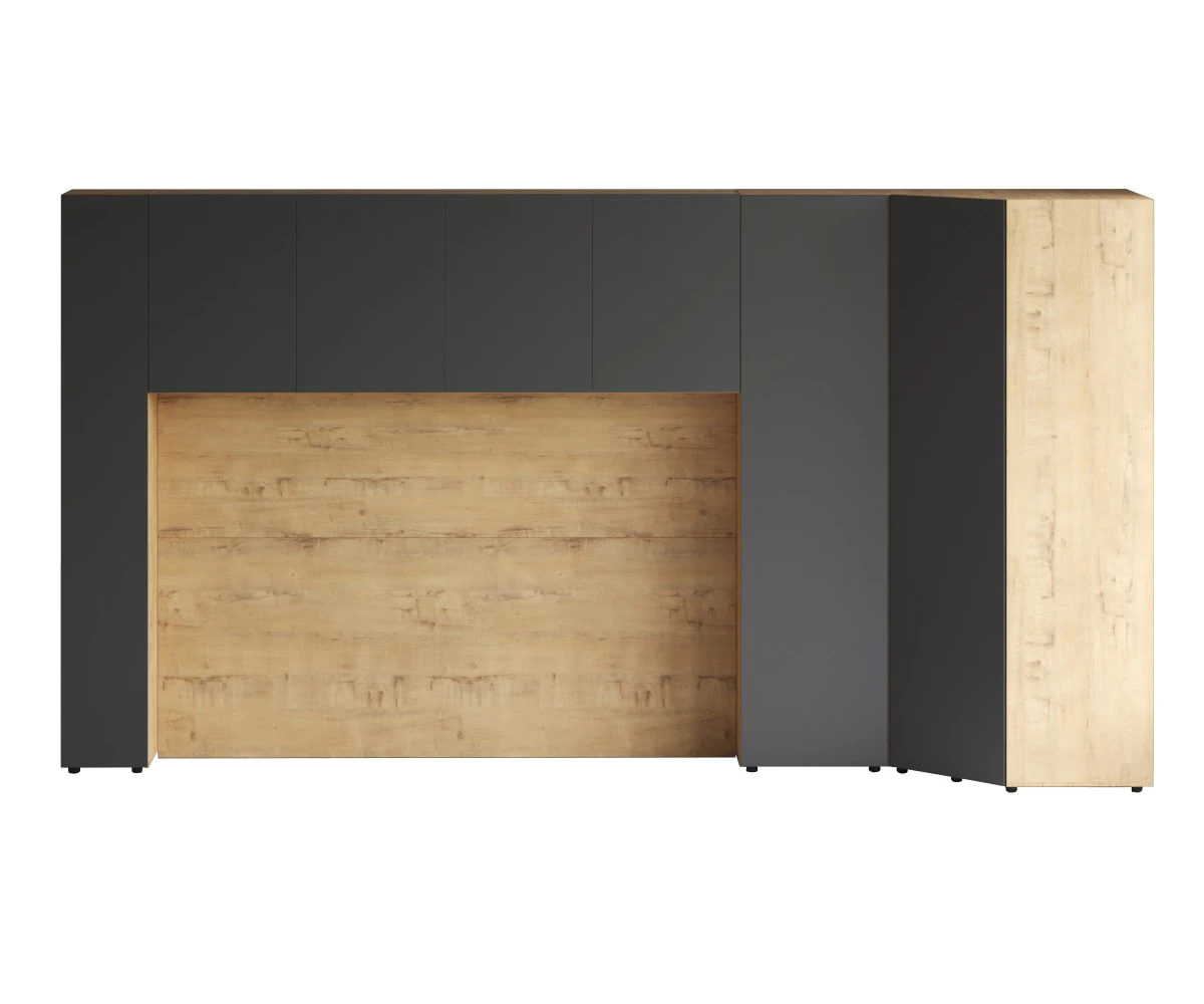 Кроватный блок предназначен для использования совместно с кроватью или диваном. Блок имеет два отделения за откидными дверьми и открытую полку над ними. Двери открываются за кромку, с помощью газовых кронштейнов. Кроватный блок оснащен светодиодным светильником, расположенным на открытой верхней полке. Светильник представляет собой алюминиевый профиль с матовым экраном, внутри которого установлена светодиодная лента. С левой и с правой стороны переднего щита блока установлены выключатели светильника и эл. розетки с разъемами USB А и Type C. Блок установлен на регулируемые опоры.