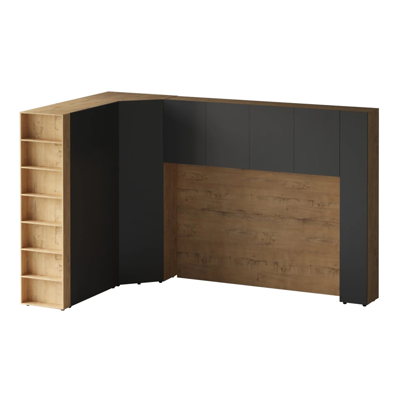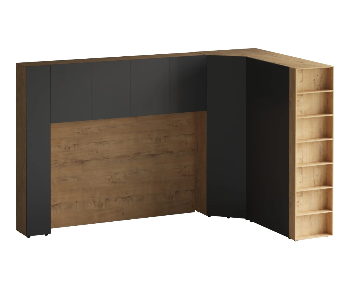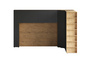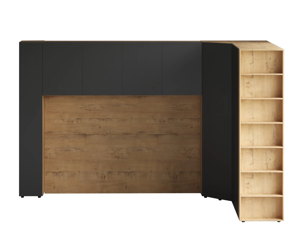 Кроватный блок предназначен для использования совместно с кроватью или диваном. Блок имеет два отделения за откидными дверьми и открытую полку над ними. Двери открываются за кромку, с помощью газовых кронштейнов. Кроватный блок оснащен светодиодным светильником, расположенным на открытой верхней полке. Светильник представляет собой алюминиевый профиль с матовым экраном, внутри которого установлена светодиодная лента. С левой и с правой стороны переднего щита блока установлены выключатели светильника и эл. розетки с разъемами USB А и Type C. Блок установлен на регулируемые опоры.