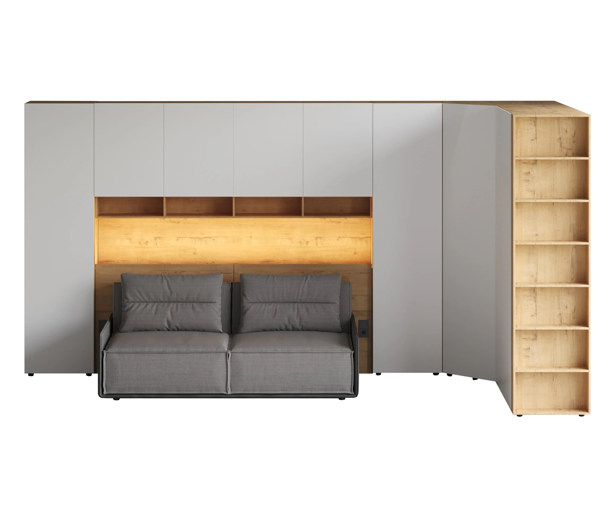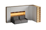 Кроватный блок предназначен для использования совместно с кроватью или диваном. Блок имеет два отделения за откидными дверьми и открытую полку над ними. Двери открываются за кромку, с помощью газовых кронштейнов. Кроватный блок оснащен светодиодным светильником, расположенным на открытой верхней полке. Светильник представляет собой алюминиевый профиль с матовым экраном, внутри которого установлена светодиодная лента. С левой и с правой стороны переднего щита блока установлены выключатели светильника и эл. розетки с разъемами USB А и Type C. Блок установлен на регулируемые опоры.