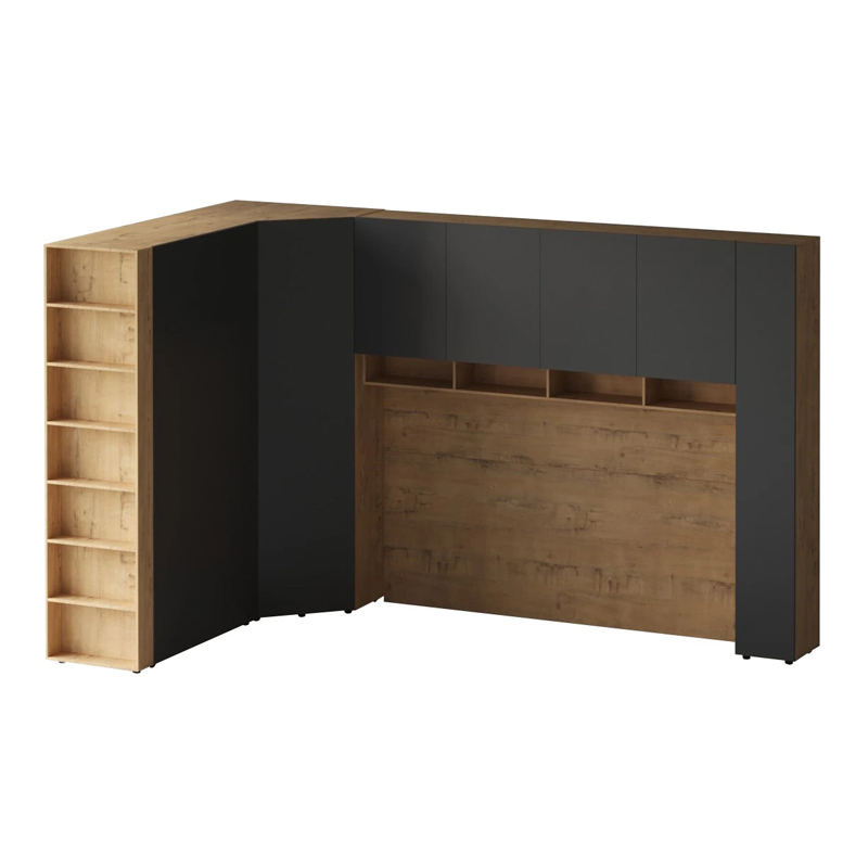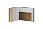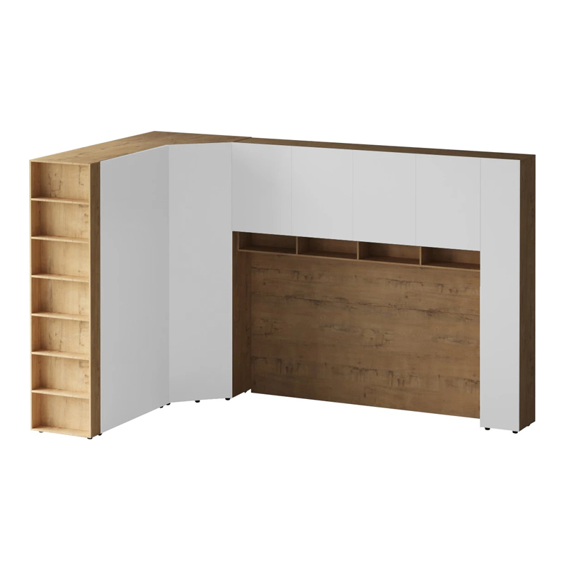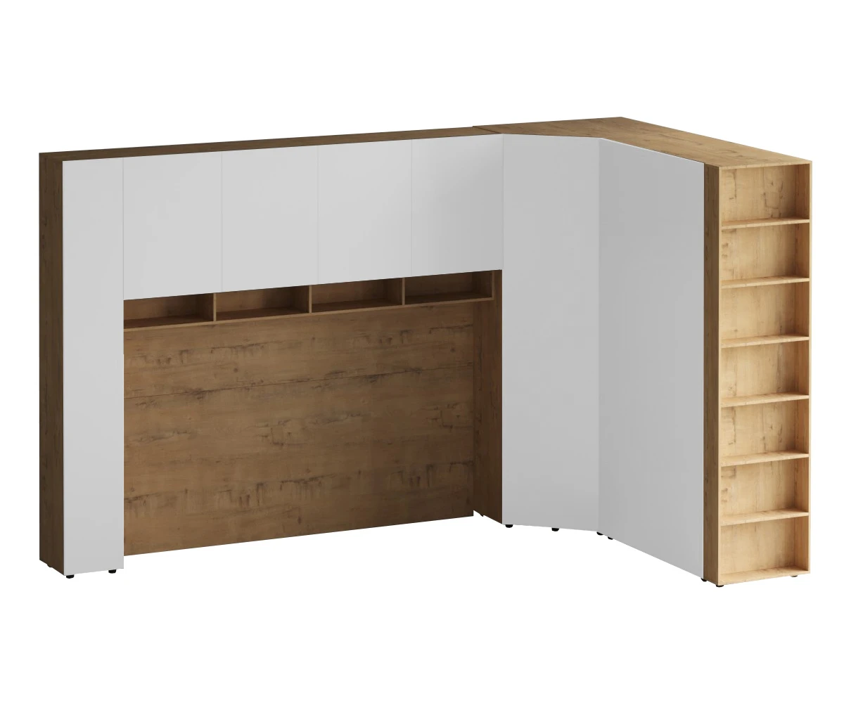 Кроватный блок предназначен для использования совместно с кроватью или диваном. Блок имеет два отделения за откидными дверьми и открытую полку над ними. Двери открываются за кромку, с помощью газовых кронштейнов. Кроватный блок оснащен светодиодным светильником, расположенным на открытой верхней полке. Светильник представляет собой алюминиевый профиль с матовым экраном, внутри которого установлена светодиодная лента. С левой и с правой стороны переднего щита блока установлены выключатели светильника и эл. розетки с разъемами USB А и Type C. Блок установлен на регулируемые опоры.