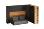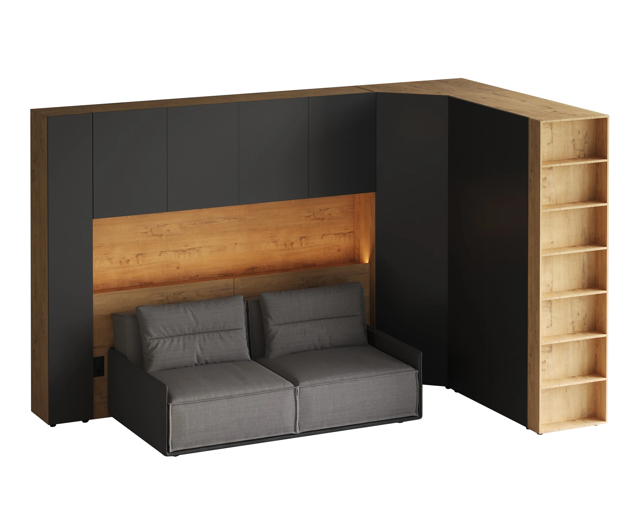 Кроватный блок предназначен для использования совместно с кроватью или диваном. Блок имеет два отделения за откидными дверьми и открытую полку над ними. Двери открываются за кромку, с помощью газовых кронштейнов. Кроватный блок оснащен светодиодным светильником, расположенным на открытой верхней полке. Светильник представляет собой алюминиевый профиль с матовым экраном, внутри которого установлена светодиодная лента. С левой и с правой стороны переднего щита блока установлены выключатели светильника и эл. розетки с разъемами USB А и Type C. Блок установлен на регулируемые опоры.