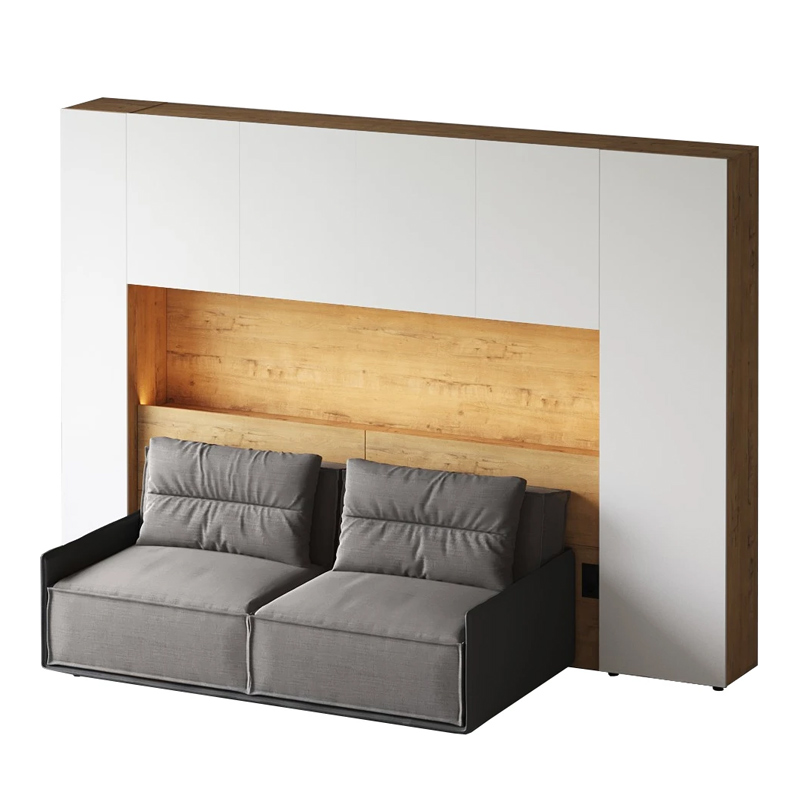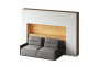 Кроватный блок предназначен для использования совместно с кроватью или диваном. Блок имеет два отделения за откидными дверьми и открытую полку над ними. Двери открываются за кромку, с помощью газовых кронштейнов. Кроватный блок оснащен светодиодным светильником, расположенным на открытой верхней полке. Светильник представляет собой алюминиевый профиль с матовым экраном, внутри которого установлена светодиодная лента. С левой и с правой стороны переднего щита блока установлены выключатели светильника и эл. розетки с разъемами USB А и Type C. Блок установлен на регулируемые опоры.
