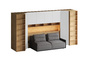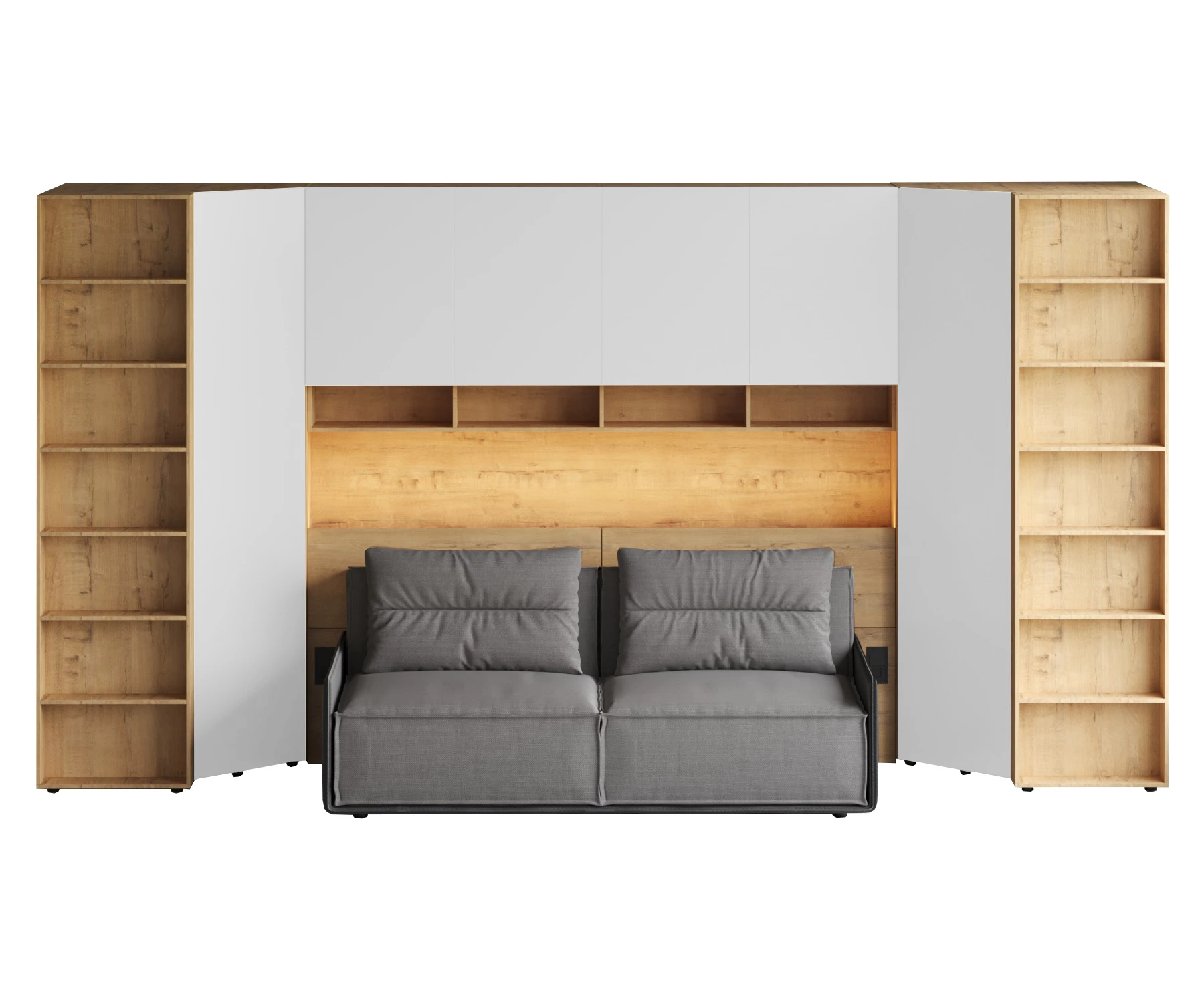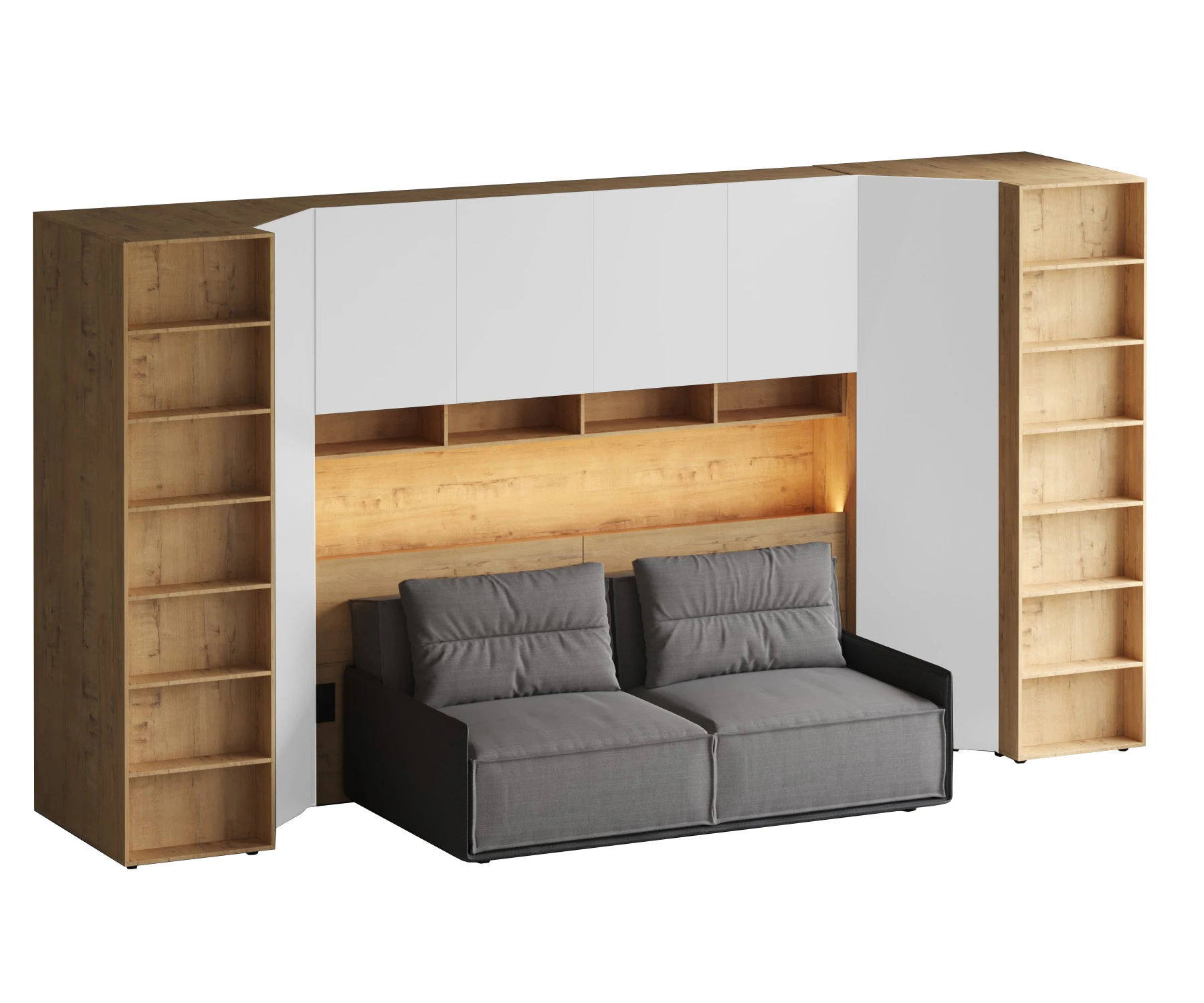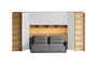 Кроватный блок предназначен для использования совместно с кроватью или диваном. Блок имеет два отделения за откидными дверьми и открытую полку над ними. Двери открываются за кромку, с помощью газовых кронштейнов. Кроватный блок оснащен светодиодным светильником, расположенным на открытой верхней полке. Светильник представляет собой алюминиевый профиль с матовым экраном, внутри которого установлена светодиодная лента. С левой и с правой стороны переднего щита блока установлены выключатели светильника и эл. розетки с разъемами USB А и Type C. Блок установлен на регулируемые опоры.